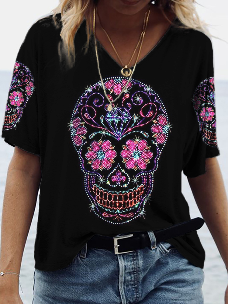 Day of the Dead Glitter Skull Art V Neck Comfy T Shirt