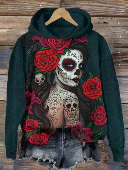 Day Of The Dead Print Skull And Floral Long Sleeve Casual Hoodie