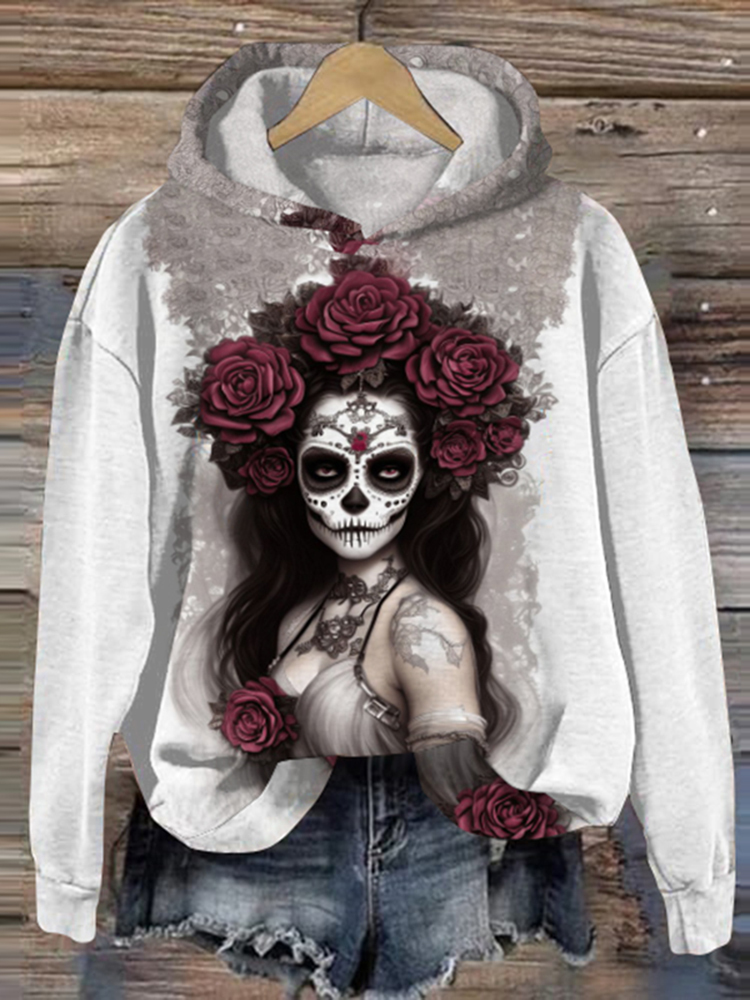 Day Of The Dead Skull Rose Draw Print Casual Hoodie