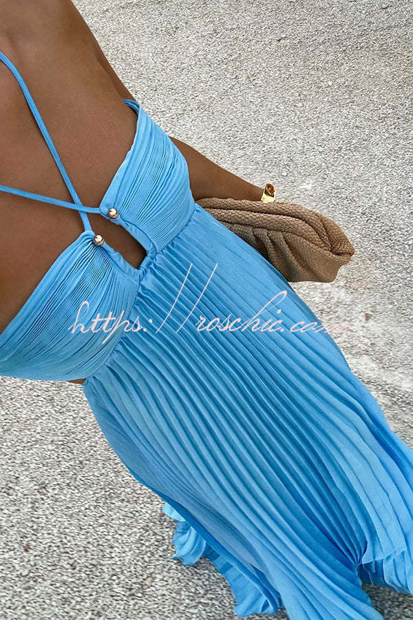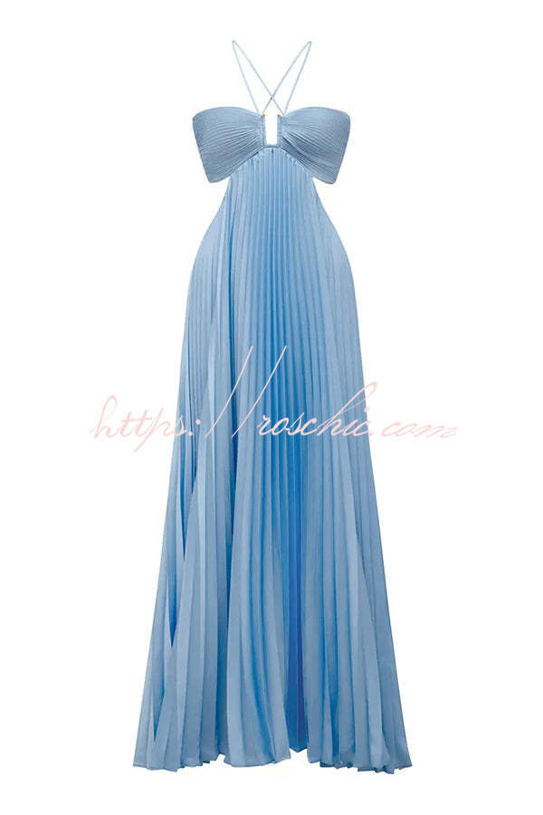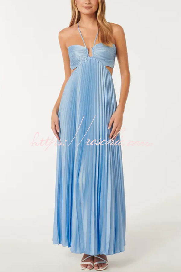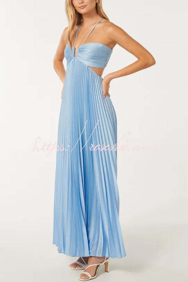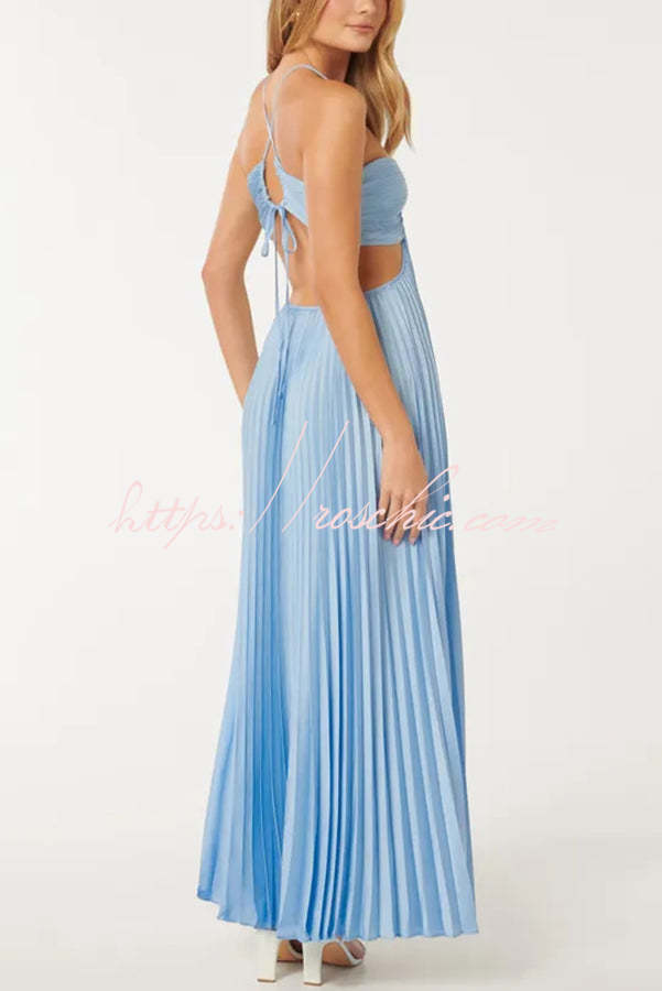 Caught Your Eye Satin Pleated Cross Straps Cutout Flowing Maxi Dress