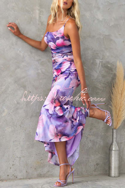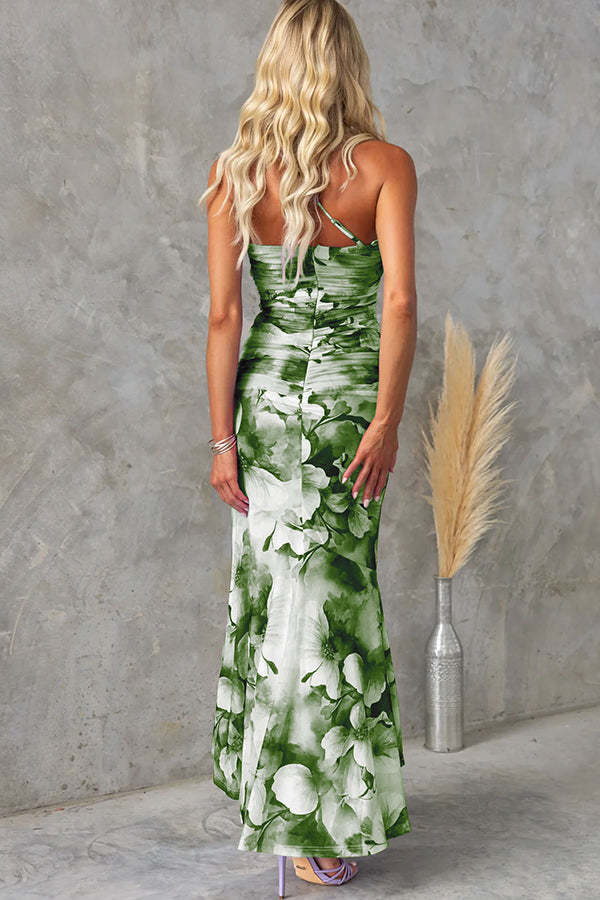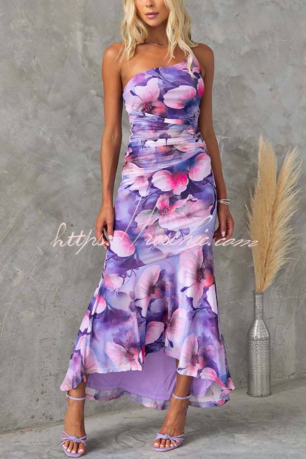 Deja Mesh Overlay Floral Print One Shoulder Ruched Stretch Maxi Dress