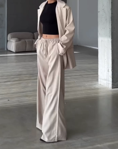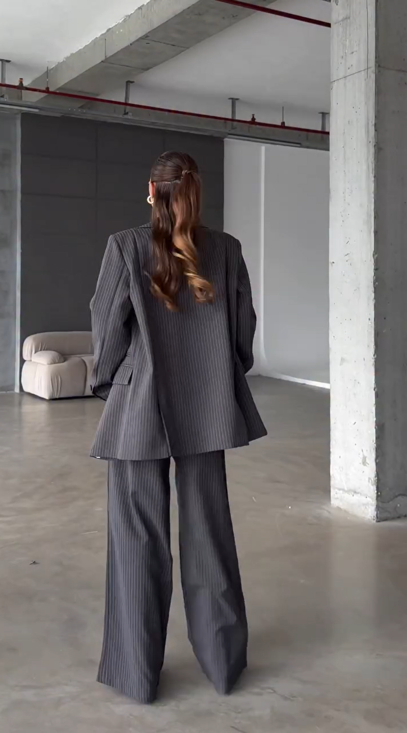 This sophisticated black striped two-piece women's suit set, featuring a blazer and pants, iscrafted from a high-quality blend of 95% polyester and 5% spandex, offering a smoothtexture with a hint of stretch for added comfort. Designed with a relaxed, oversized fit, theblazer showcases a classic peak lapel, a refined double-breasted closure, and a center ventfor effortless movement. Thoughtful details such as four cuff buttons on the sleeve slits andreal pockets enhance both style and functionality. The matching pants complement theblazer with a tailored yet comfortable silhouette, making this suit a versatile choice forbusiness meetings, formal events, or chic casual outings. Pair it with heels for a polished,powerful look or with sneakers for a modern, effortless vibe. Easy to care for with bothmachine and hand wash options, this suit also allows for color or size customization-simply leave a note with your order.