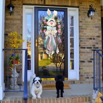 So excited for this design! This XL wreath is made on an oval faux pine base and filled with jute burlap mesh, lots of designer ribbon, flowers, greenery, Easter eggs and centered with the cutest handmade bunny and handmade rag bow!
