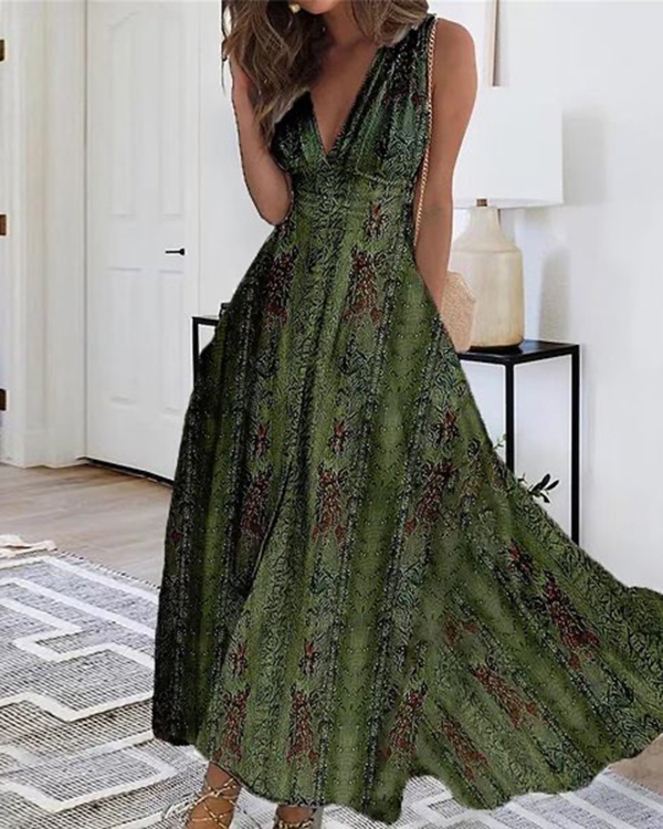 Elegant V Neck Vintage Print Casual Dress Long Dress