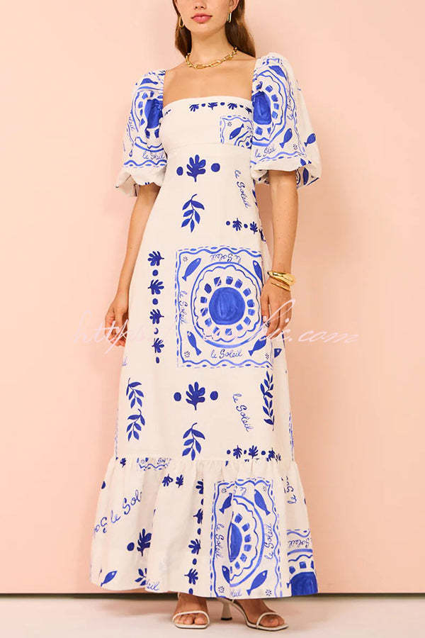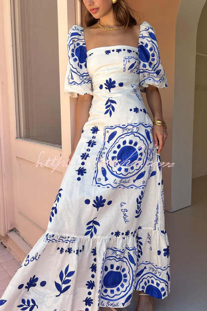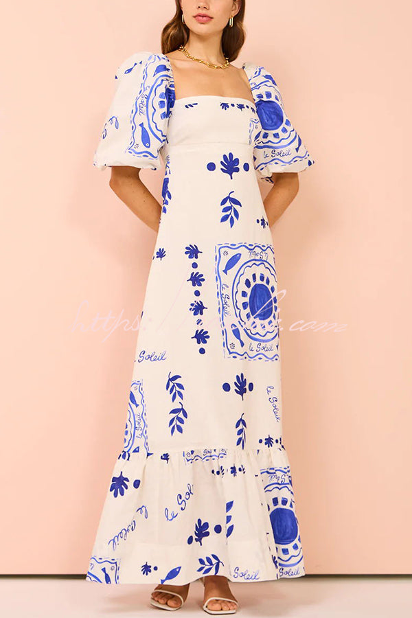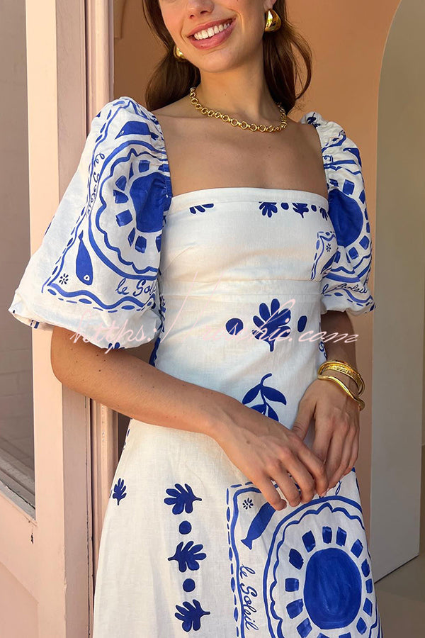 Sherbert Linen Blend Unique Print Square Neck Bubble Sleeve Maxi Dress