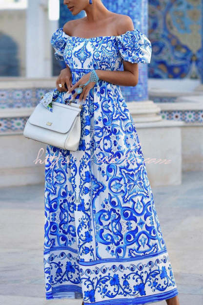 Enjoy The Adventure Printed Off Shoulder Puff Sleeve Maxi Dress