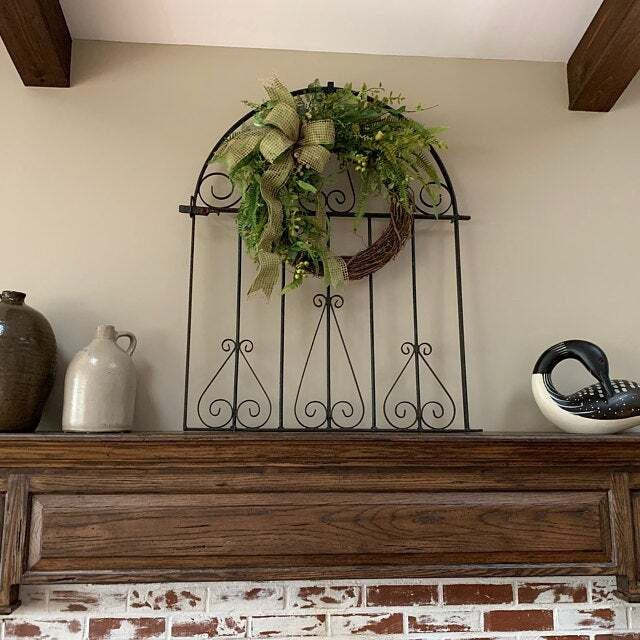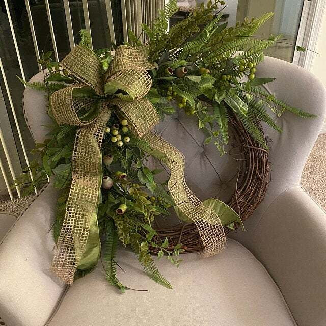 This wreath is the perfect accent for a front door or interior space. A wild wired burlap bow is surrounded by realistic pods, greenery and fern. This wreath's greenery has a light and airy feel where the grapevine base is visible in places.
