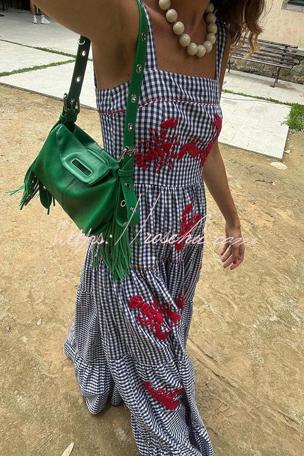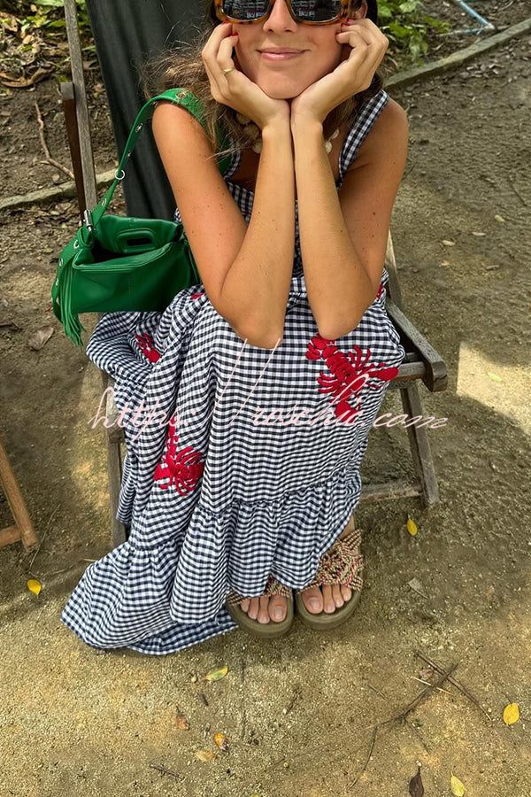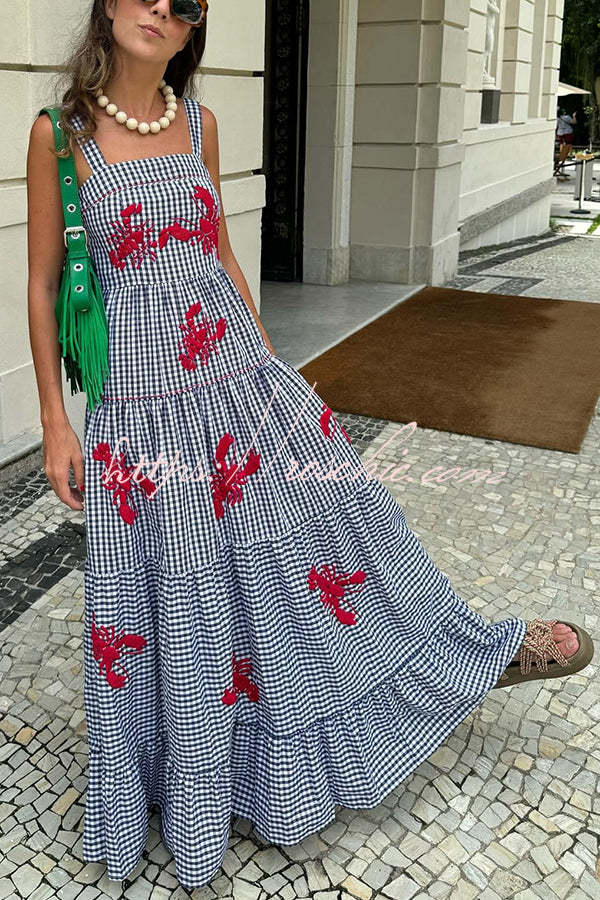 Funny Summer Plaid Lobster Print Square Neck Layered Maxi Dress