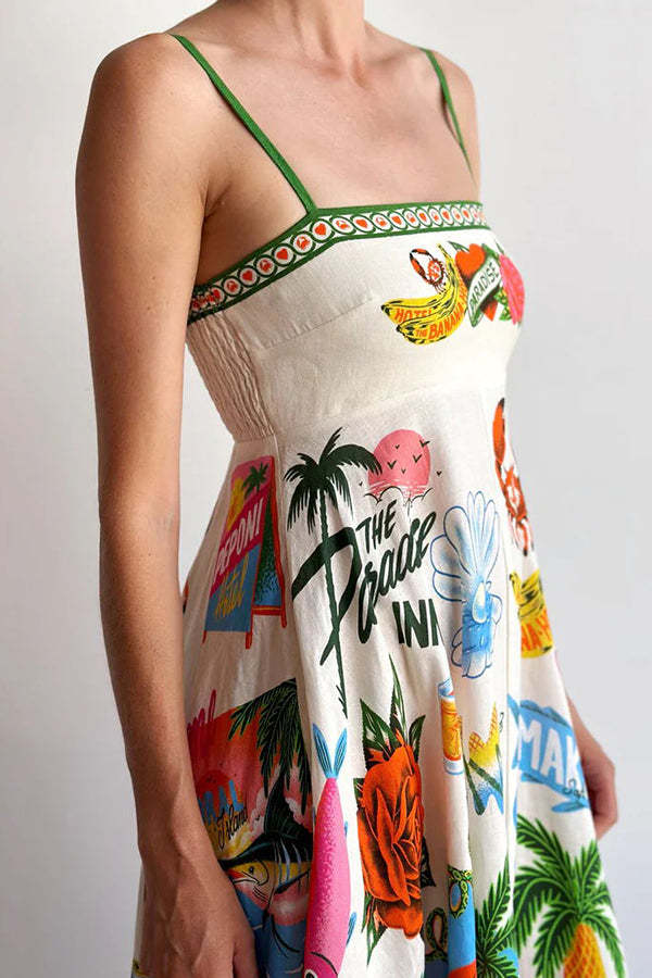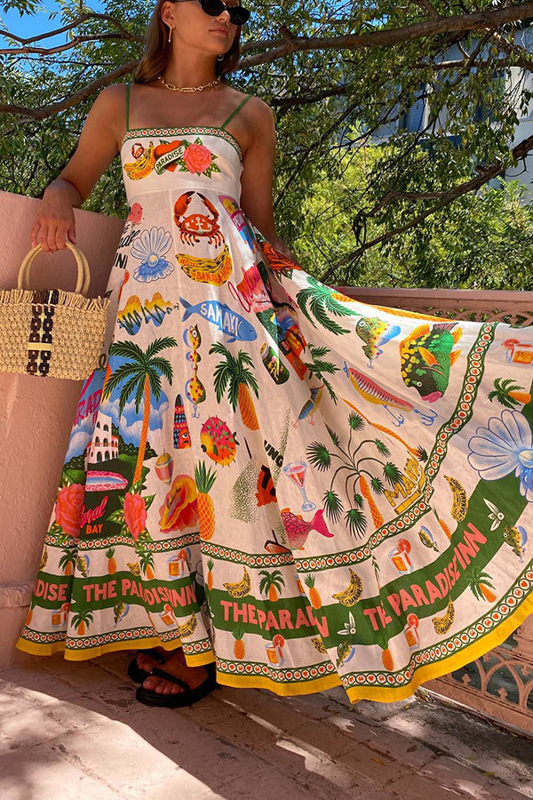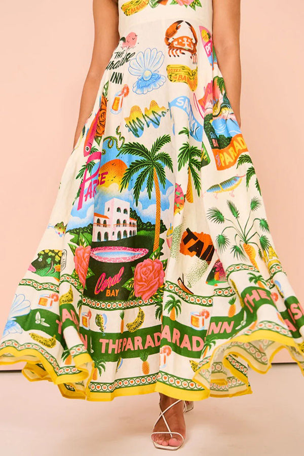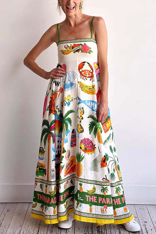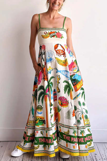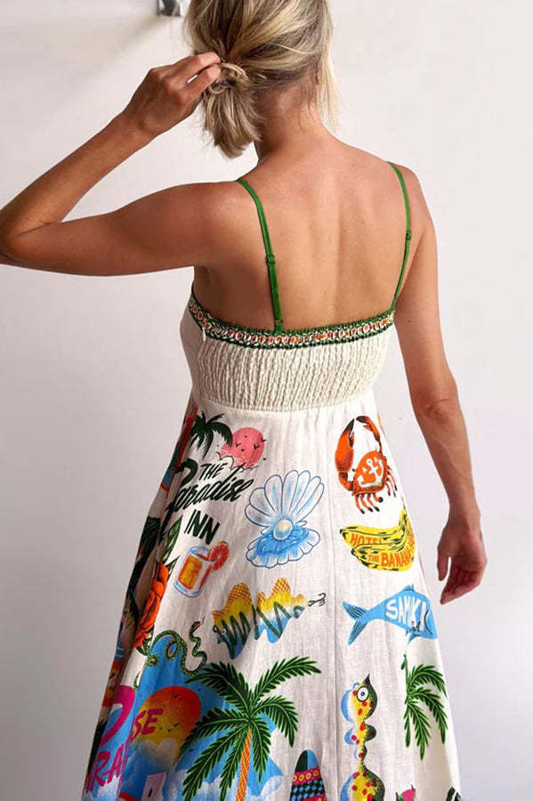 Holiday Paradise Linen Blend Unique Print Smocked Back Pocket Maxi Dress