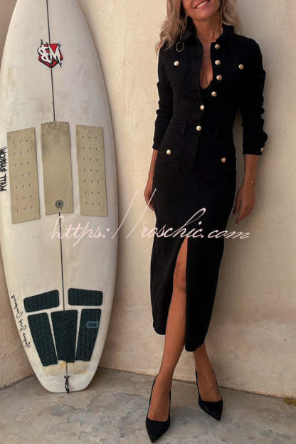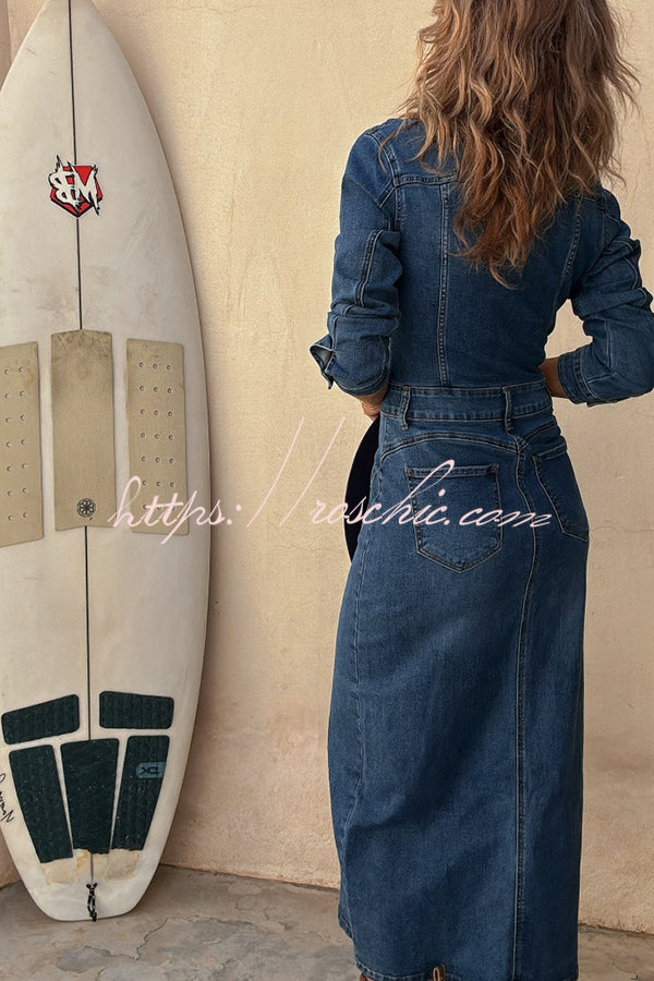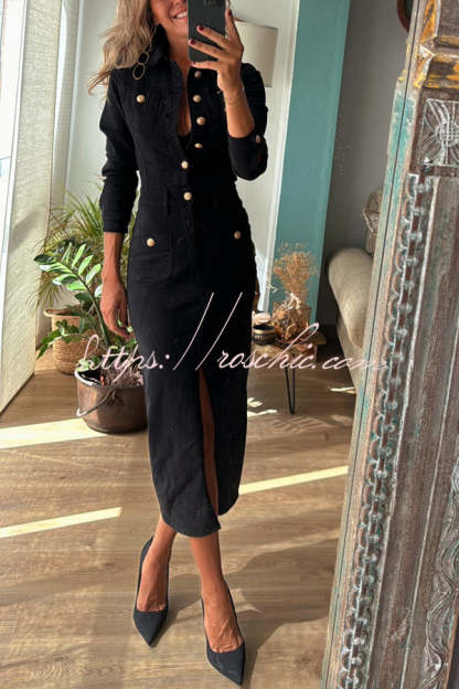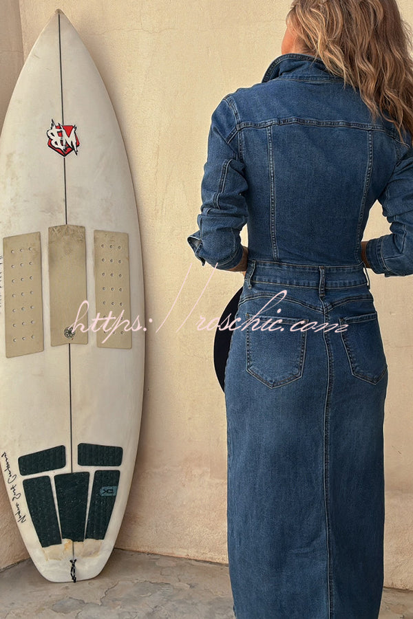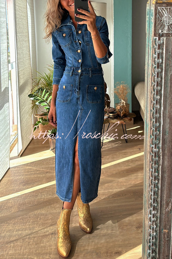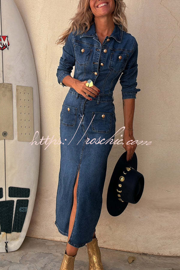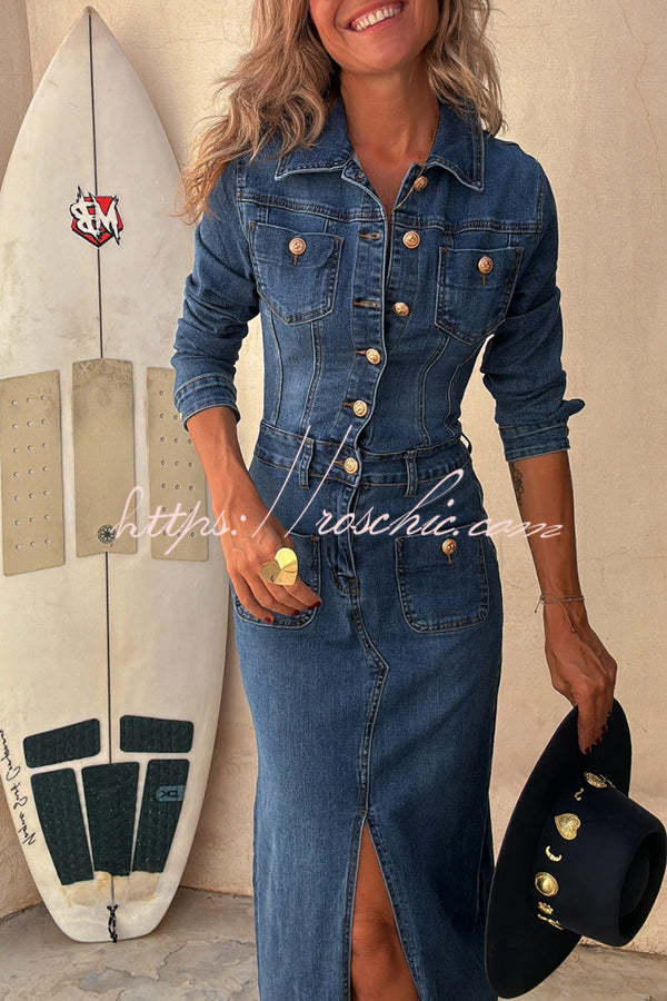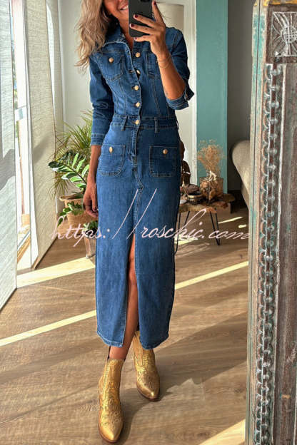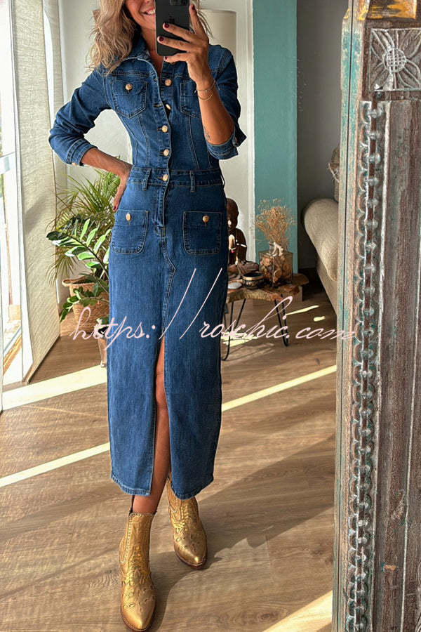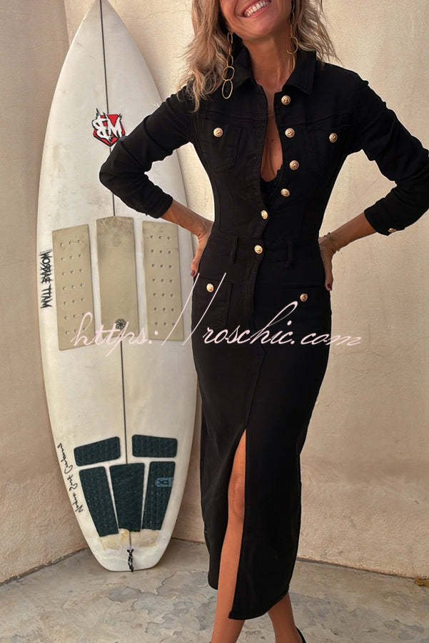 Tessy Denim Metal Button Zipper Shirt Stretch Pencil Slit Midi Dress