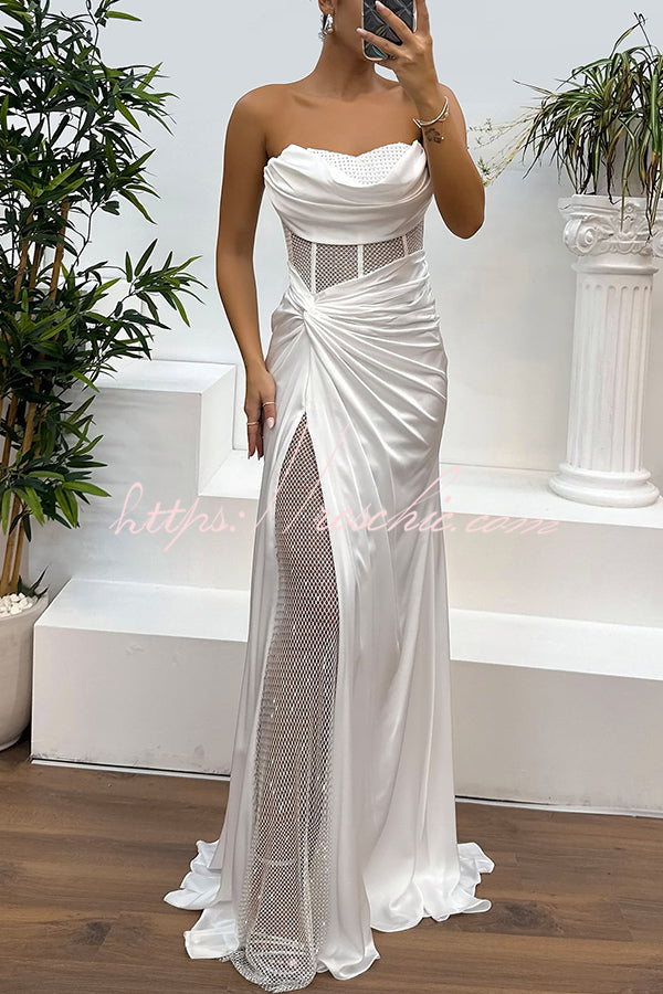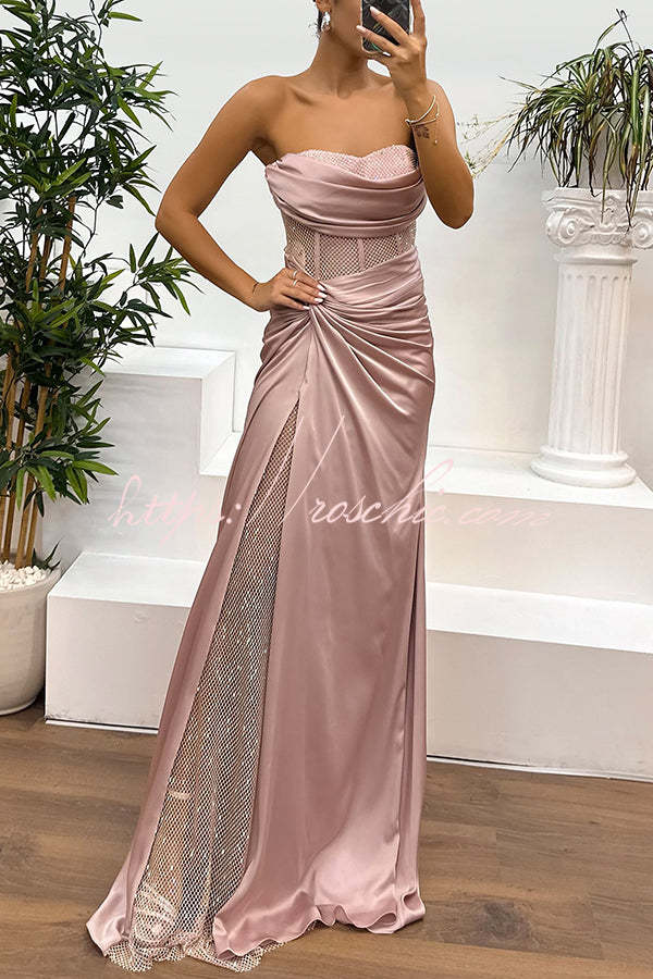 Audrey Satin Paneled Mesh Sequin Fabric Off Shoulder Ruched Drape Maxi Dress