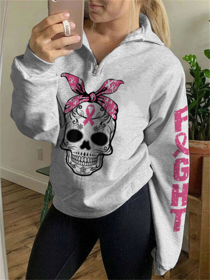 Fight Pink Ribbon Skull Print Zip Up Sweatshirt
