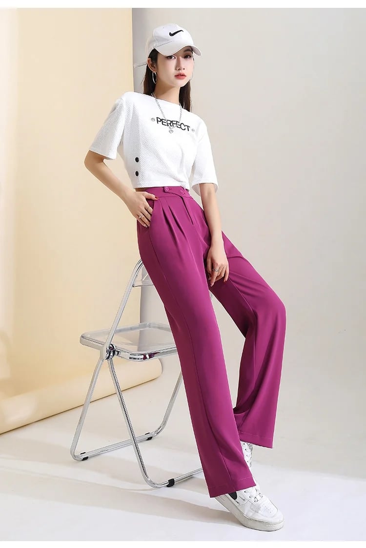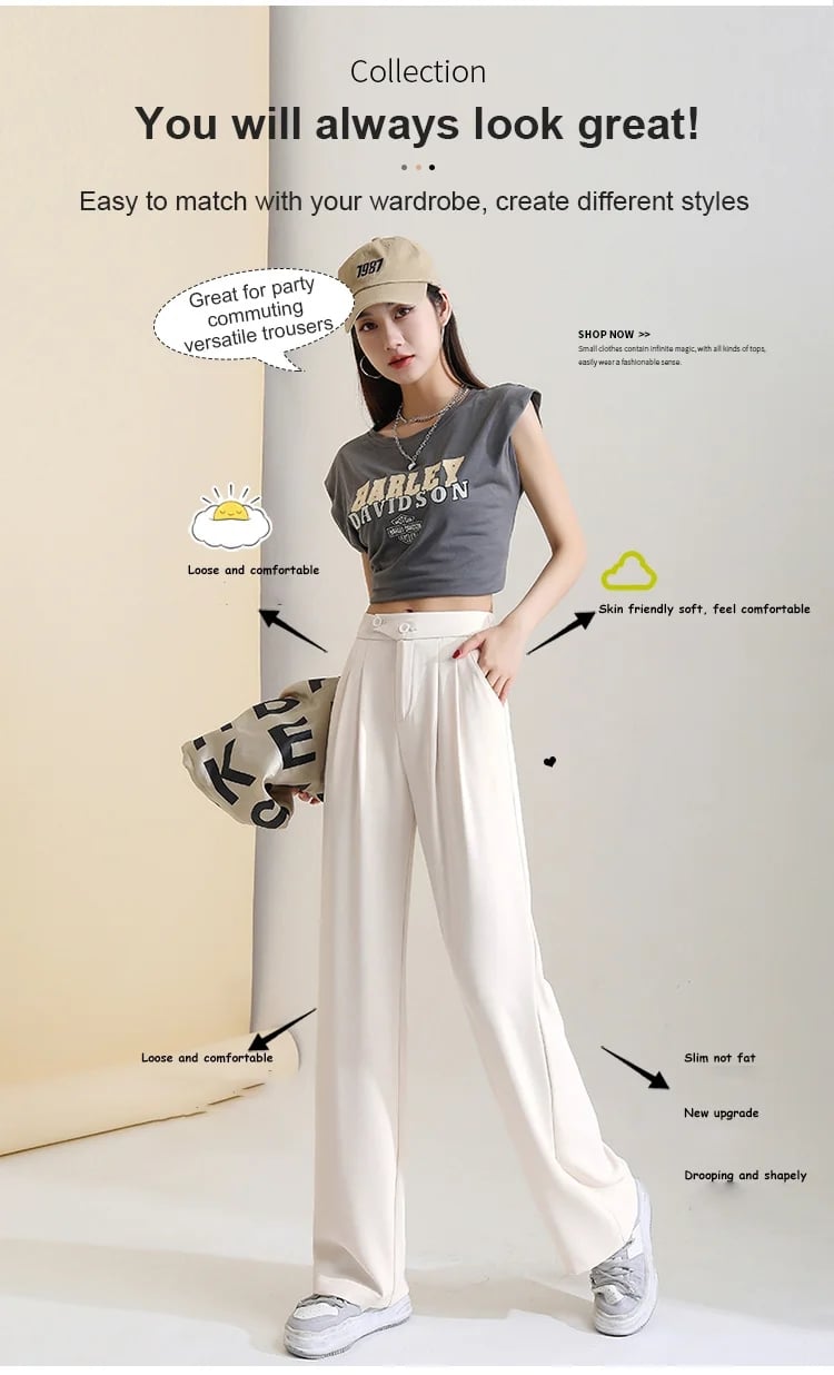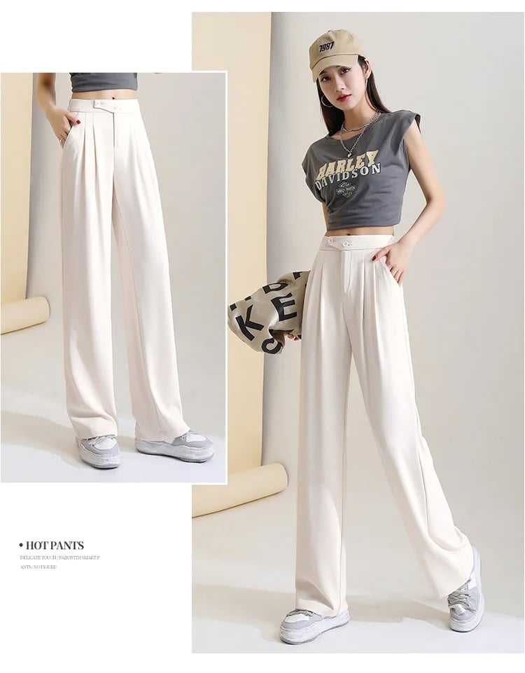 High-waisted wide-leg pants can be worn in a variety of ways, and you can adjust them to suit your style and the occasion. No matter what kind of top you choose, these pants will perfectly illustrate your taste. It is both fashionable and practical, allowing you to show your distinctive charm on any occasion.