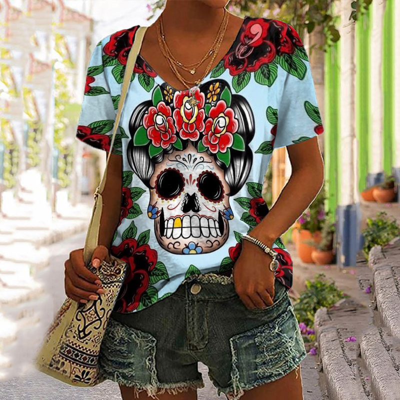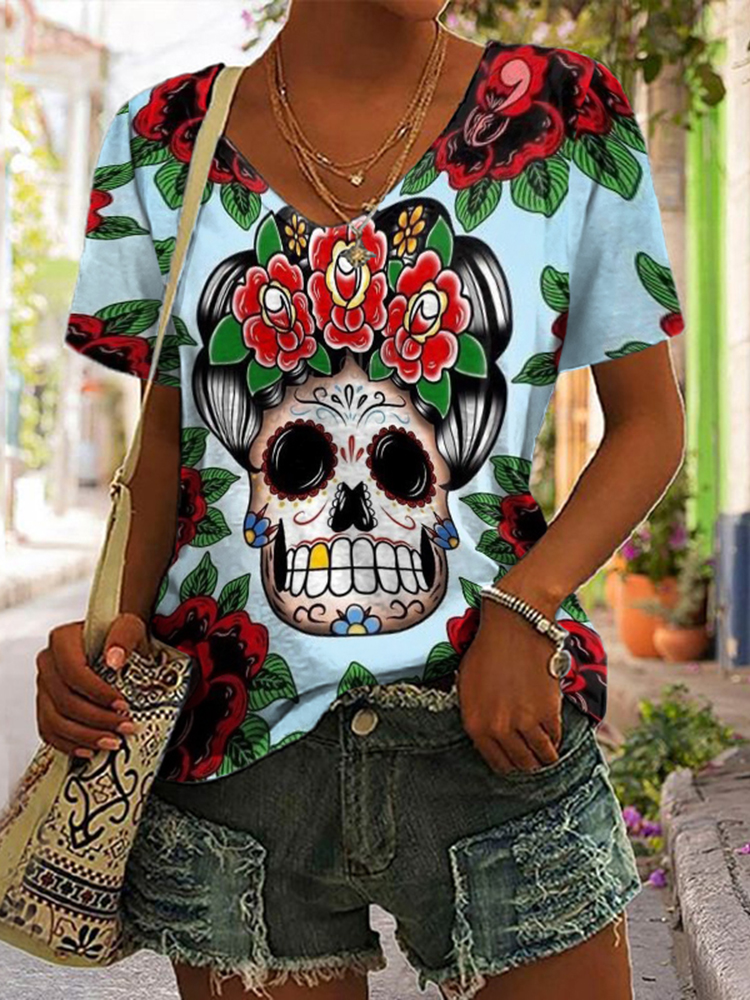Floral Skull Print Short Sleeve T-Shirt