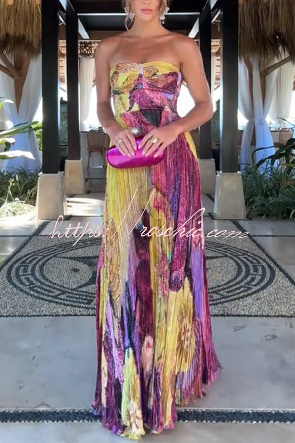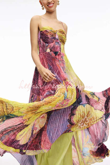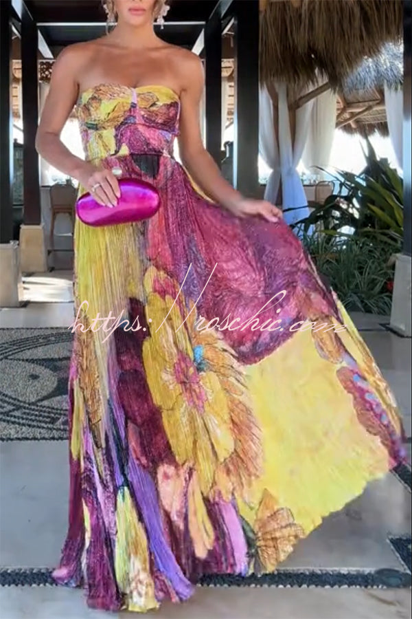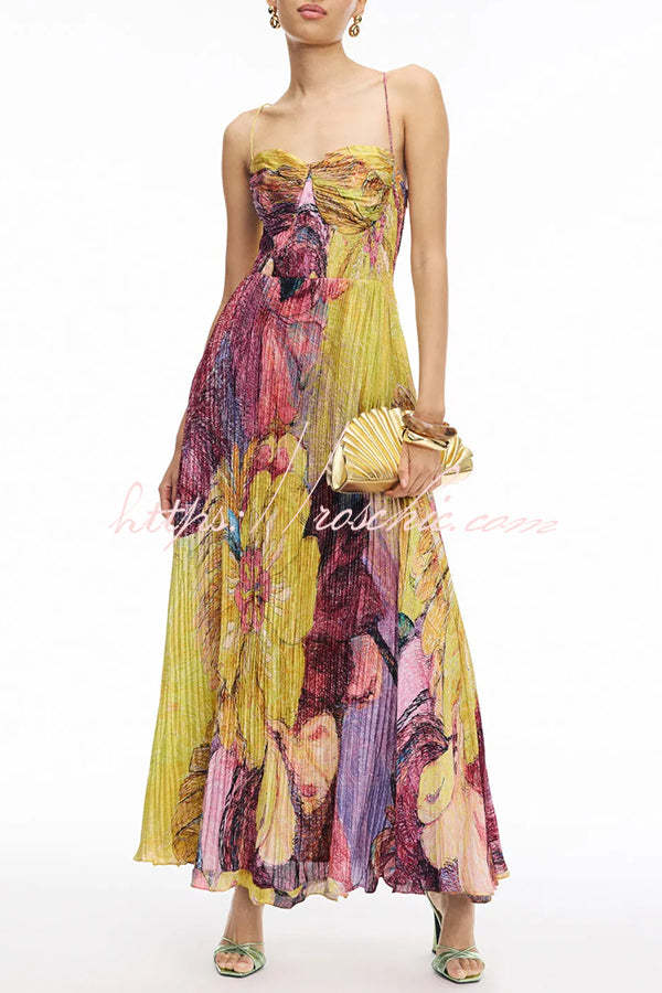 Vibrant and Bold Floral Print Sweetheart Neck Pleated Maxi Dress