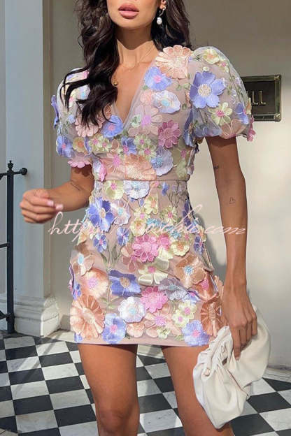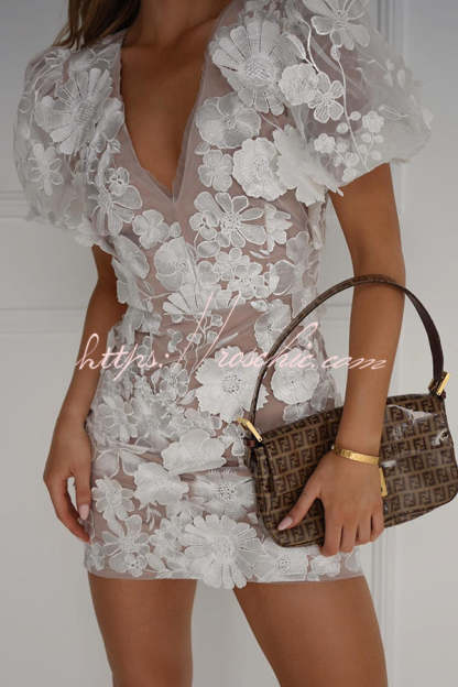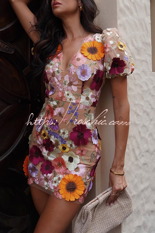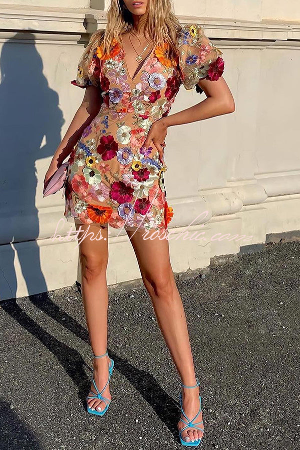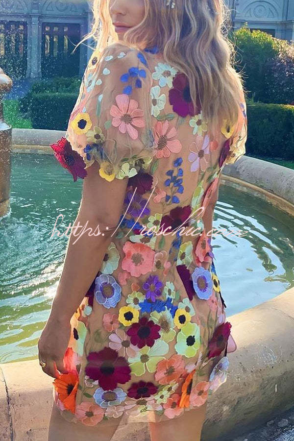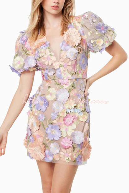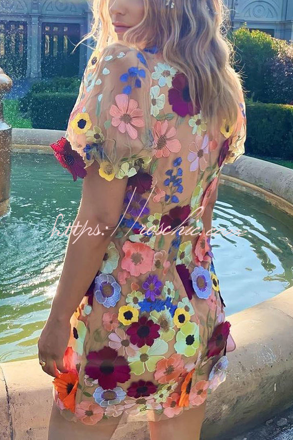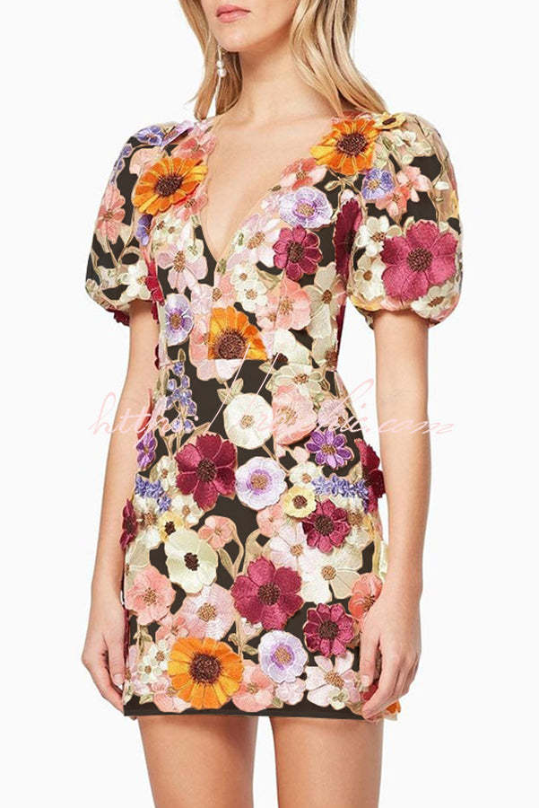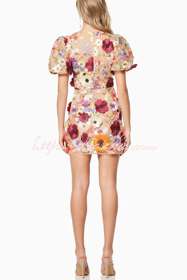 Garden Gala Embroidered Floral Applique Puff Sleeve Mini Dress