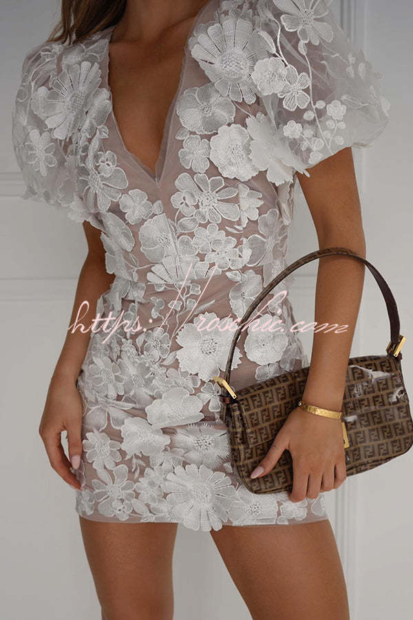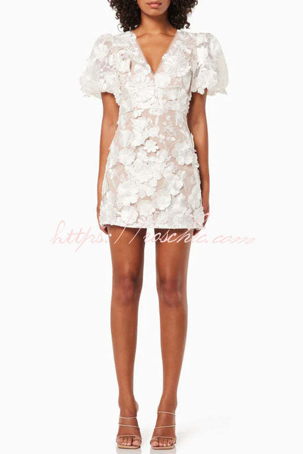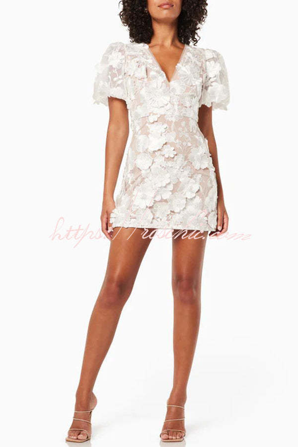 • Introducing the Lace Mini Dress, a playful and glamorous ensemble designed for modern romance. Puffed short sleeves and a V-shaped neckline create a flattering silhouette that exudes feminine charm. Made from intricate 3D lace fabric, this dress is a true work of art.
