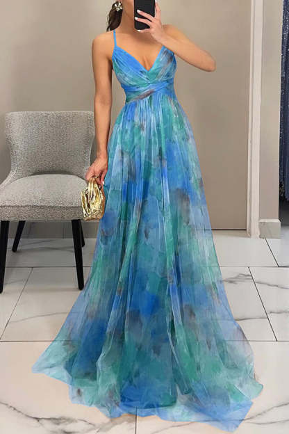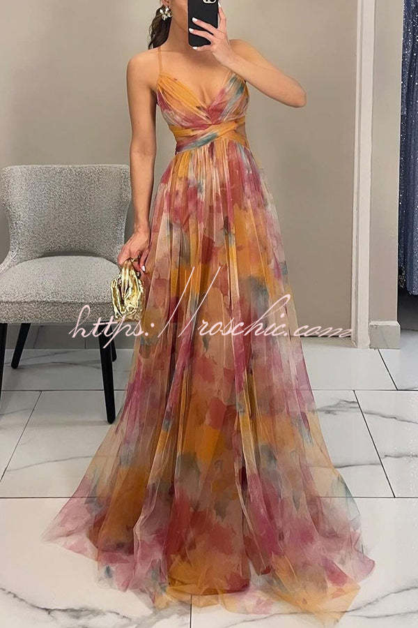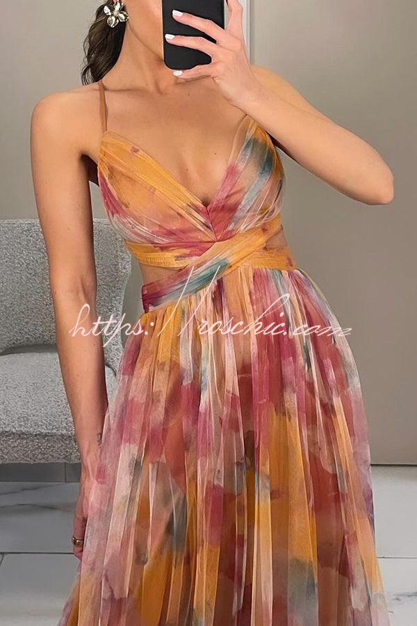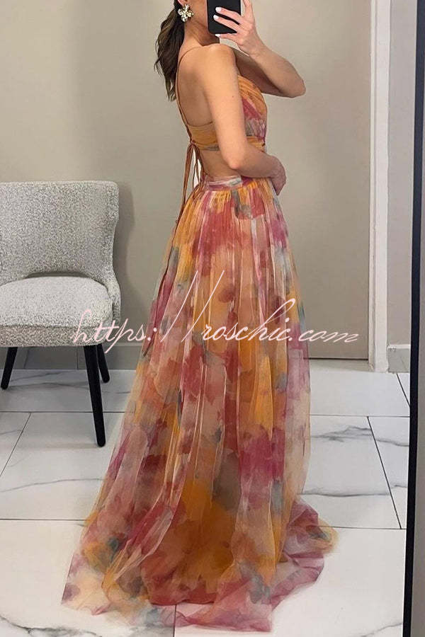Giselle Tulle Render Floral Print Cutout Waist Back Lace-up Maxi Dress