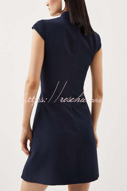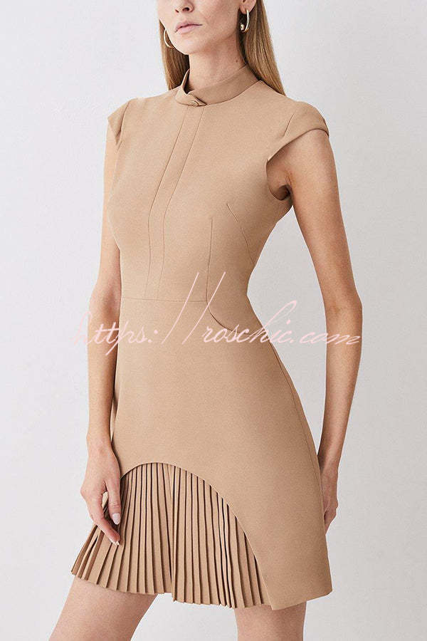 Military Style Cap Sleeve High Neck Patchwork Pleated Hem Mini Dress