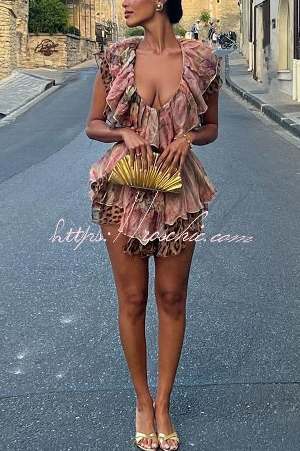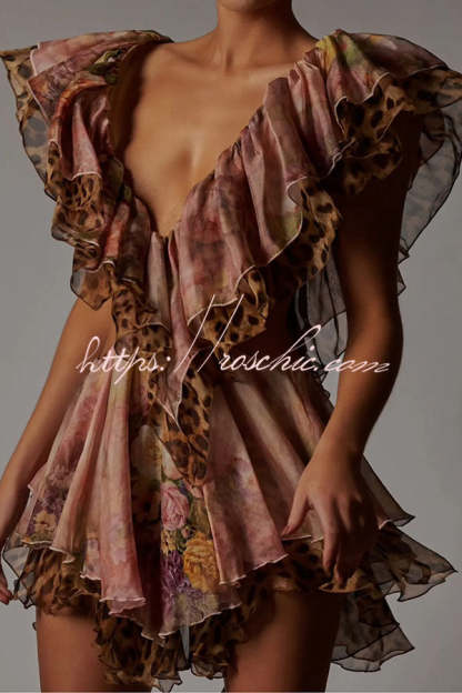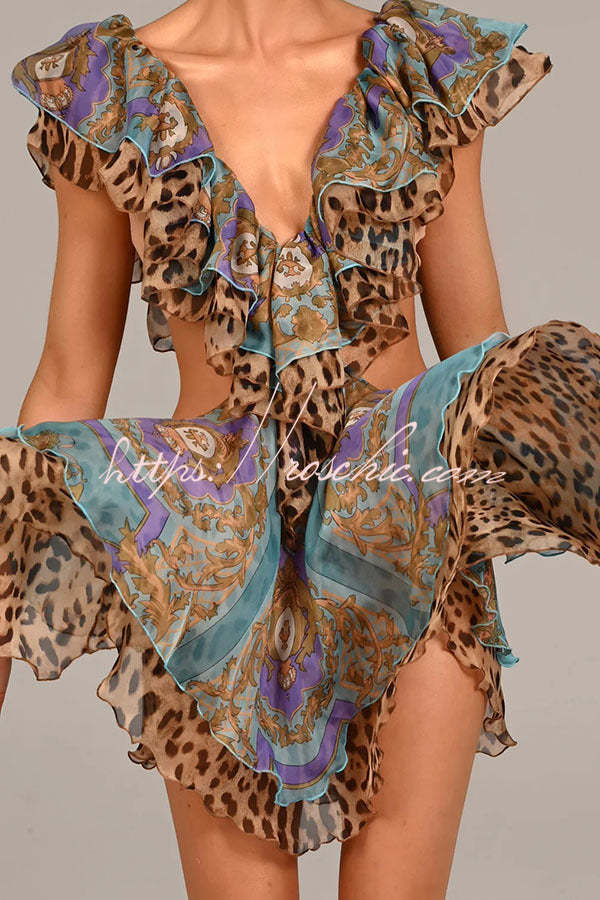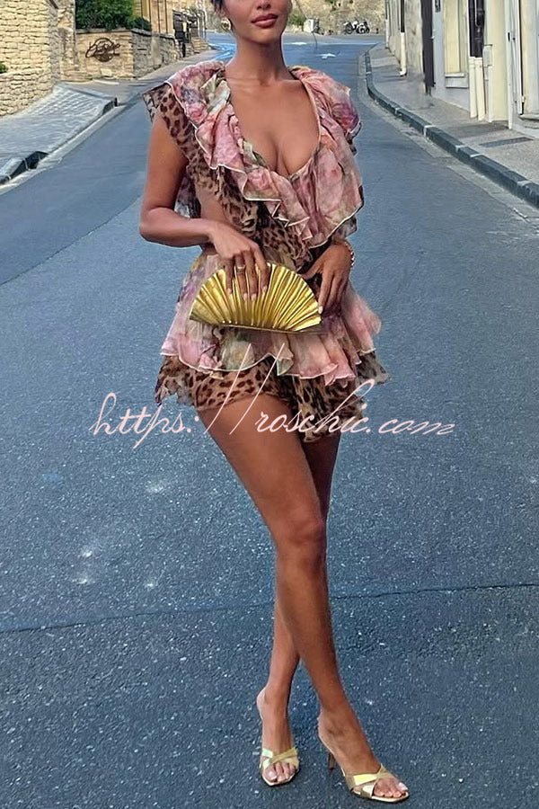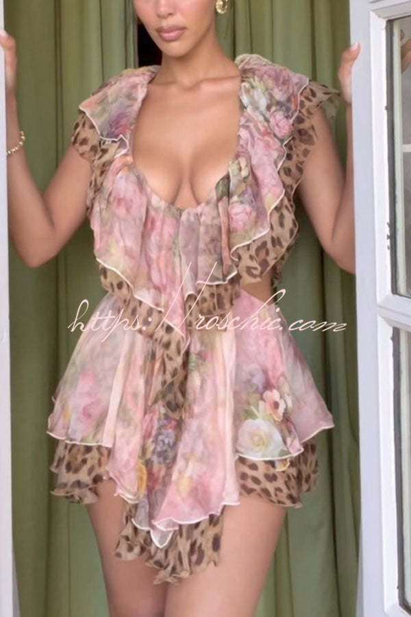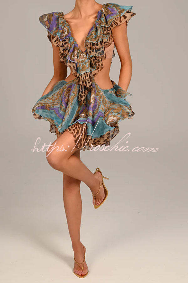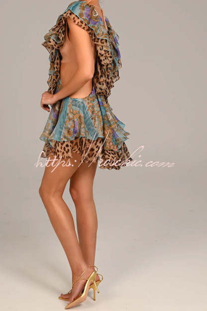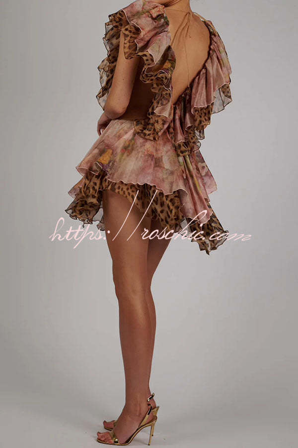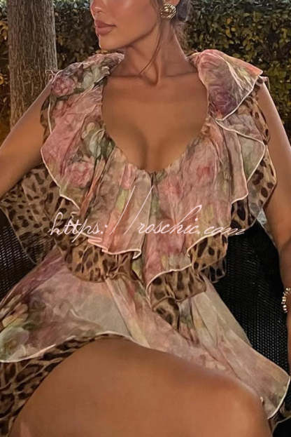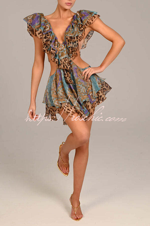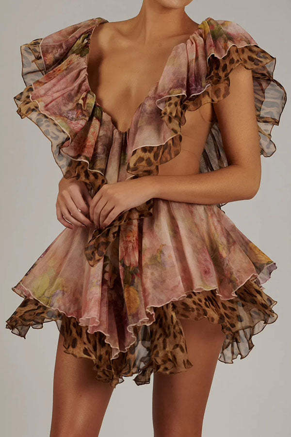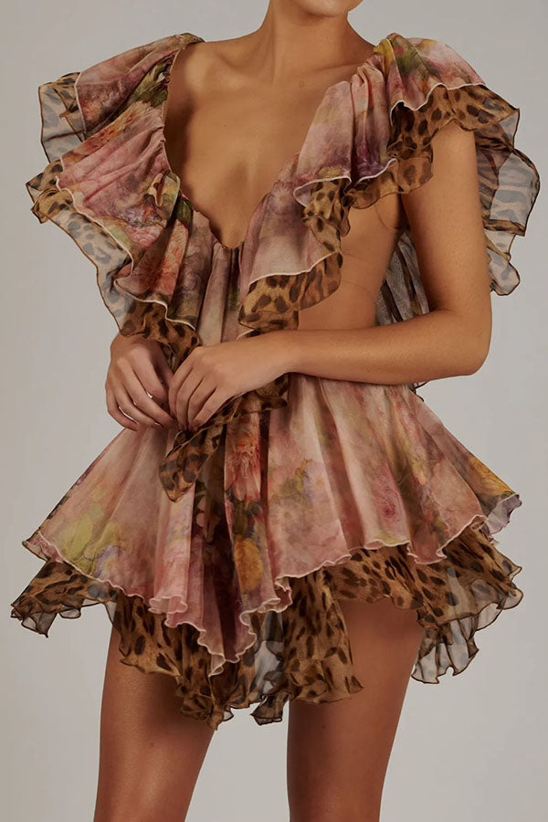 Dreamy Island Floral Leopard Print Cutout Waist Tiered Ruffles Mini Dress