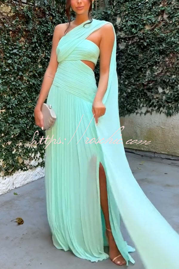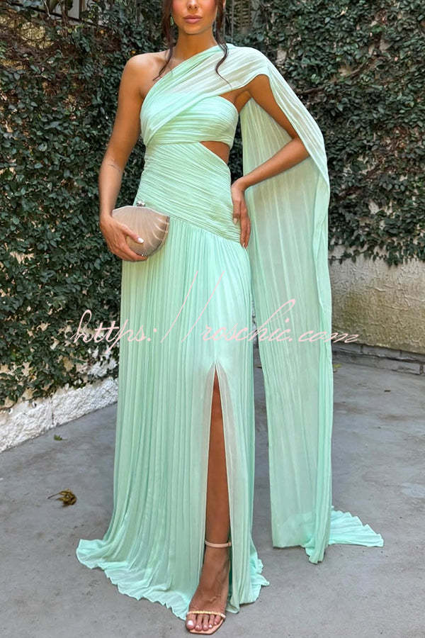 Forest Muse Chiffon Pleated Off Shoulder Cutout Waist Cape Maxi Dress
