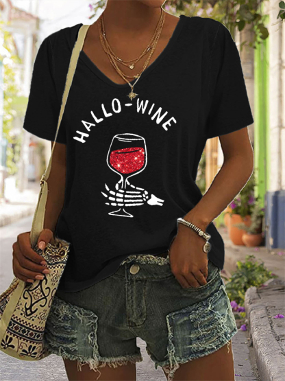 Hallo Wine Glitter Graphic V Neck T Shirt