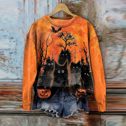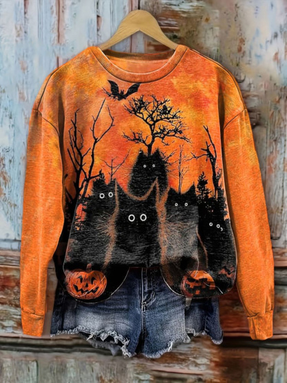 Halloween Black Cat Print Casual Sweatshirt