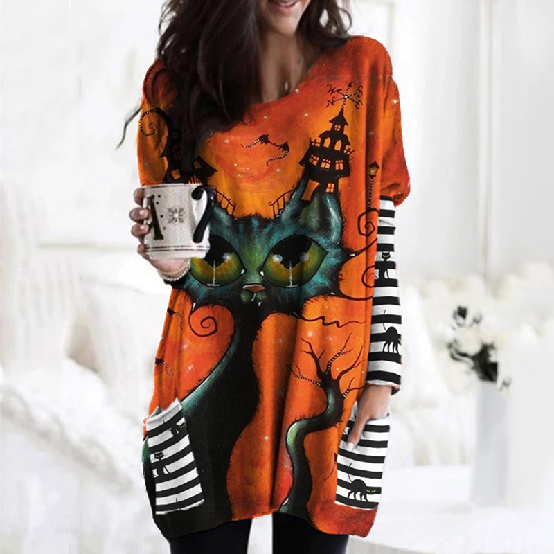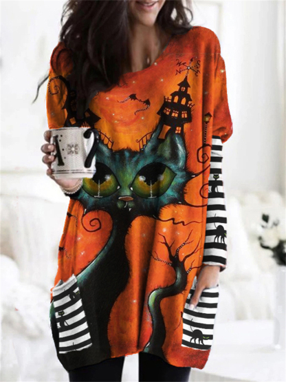 Halloween Cat Witch Striped Patch Pocket Tunic