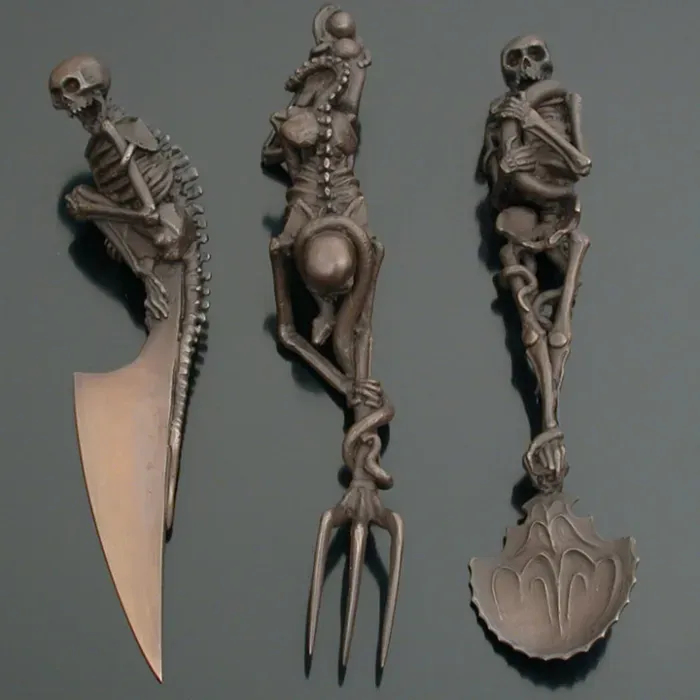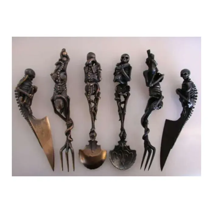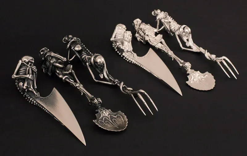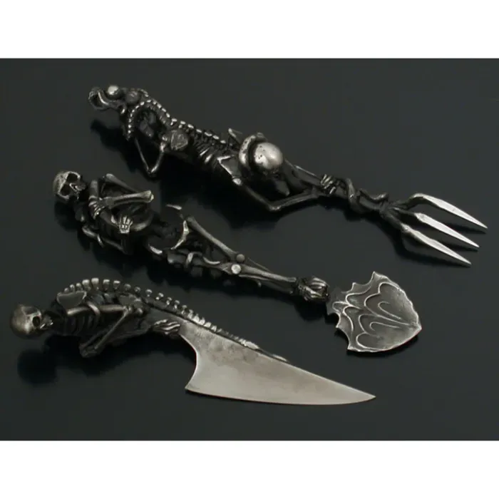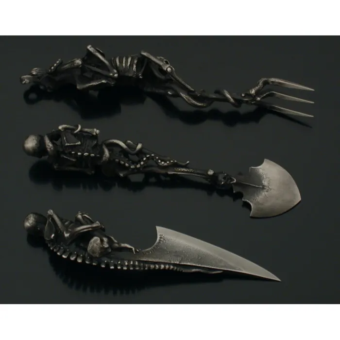 I am willing to wager that when the devil sets his table, he uses Artist Skeletal Cutlery. it is a Dutch artist who specializes in making all sorts of macabre and badass weapons, furniture and jewelry pieces.