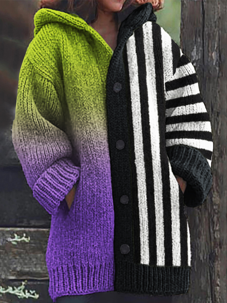Halloween Horror Movie Gradient Striped Contrast Cozy Knit Hooded Cardigan