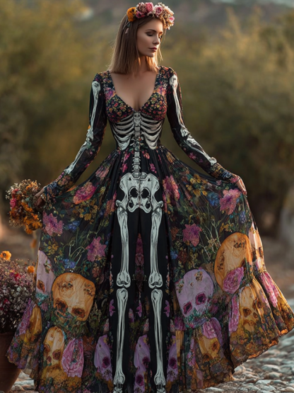 Halloween Plant Flower And Skeleton Bone Pattern Combined Design Women Long Cotton And Linen Dress