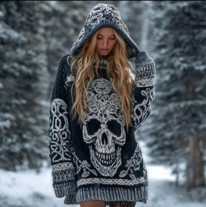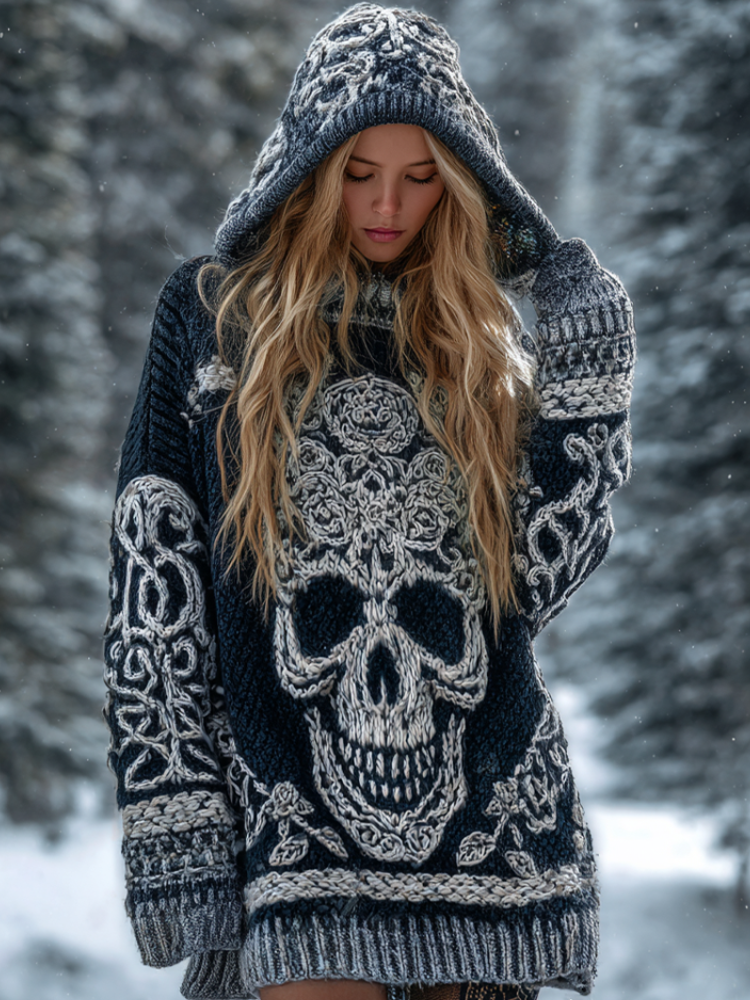 Halloween Skeleton Element Viking Style Women's Hooded Pullover Knit Sweater
