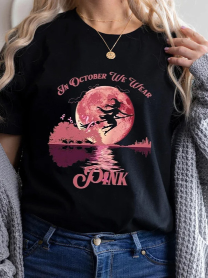 Halloween Witch In October We Wear Pink Print T-Shirt