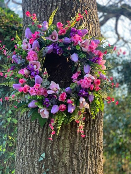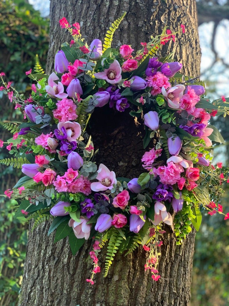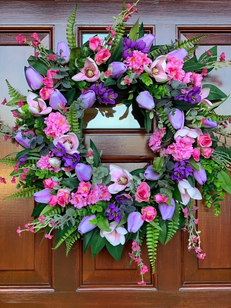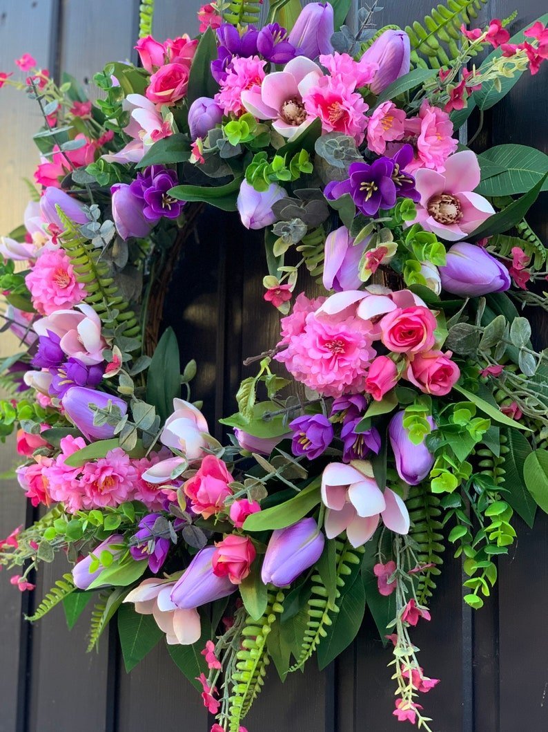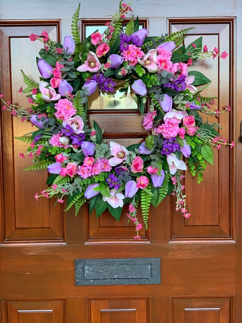 Handmade spring faux flower door wreath decoration. Vibrant spring colours of pinks, purples and greens. Full of lilac tulips, magnolias, roses, crocus, cherry blossom and meadow flowers.