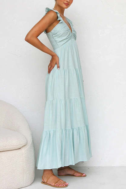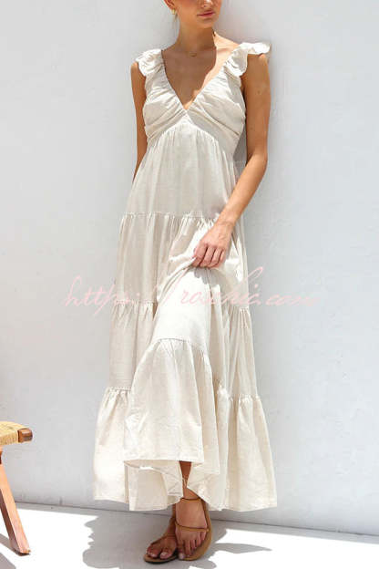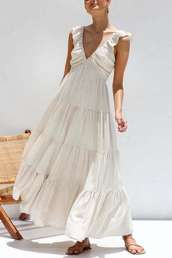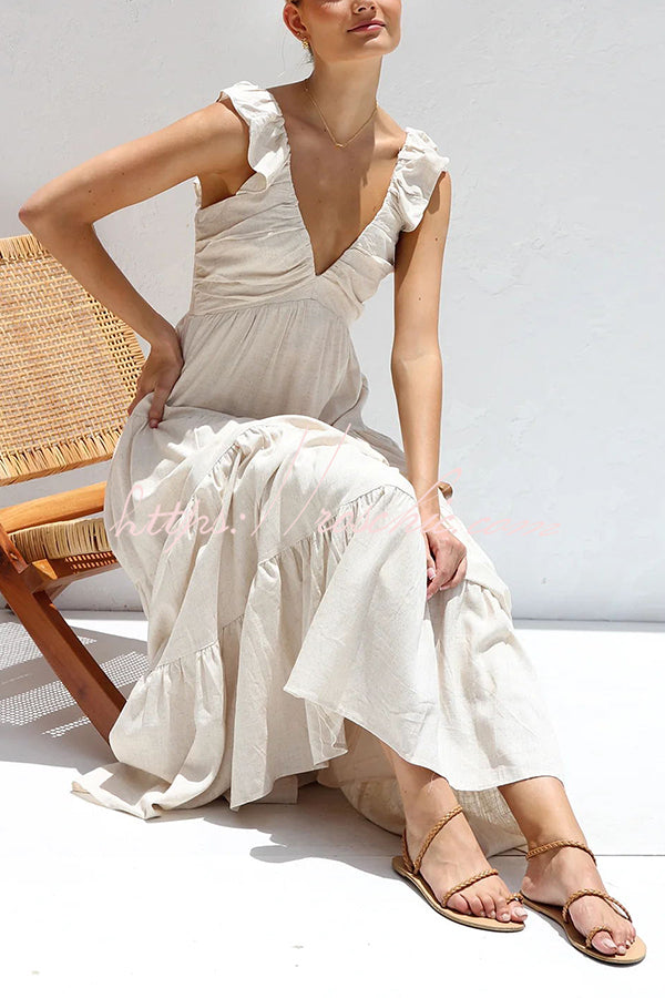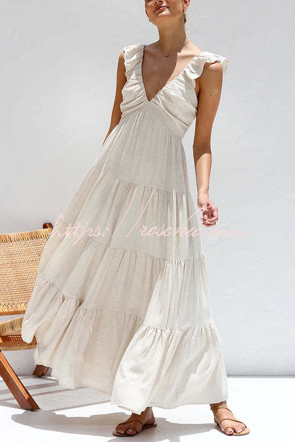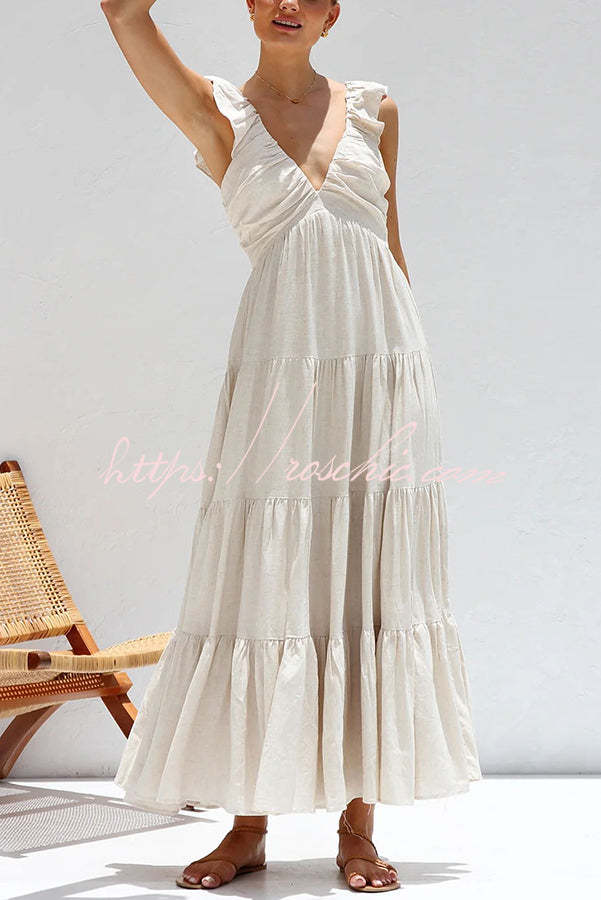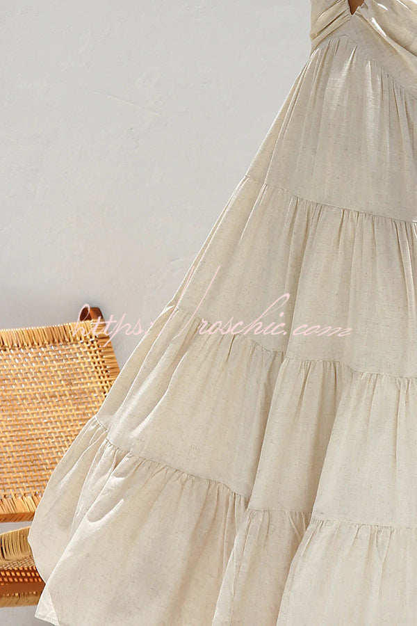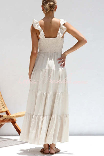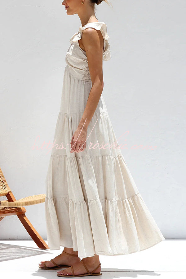 Hawaiian Brunch Linen Blend Back Smocked Tiered Vacation Maxi Dress