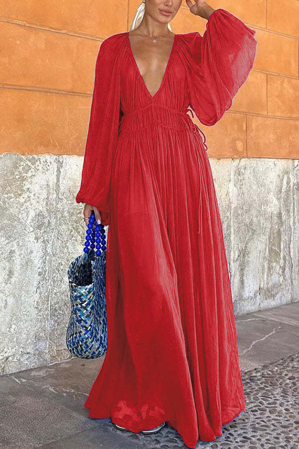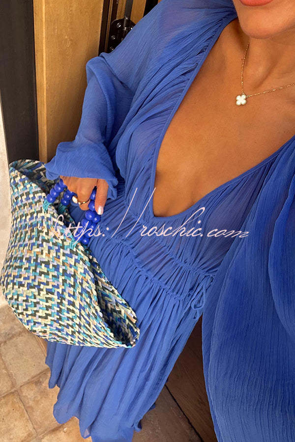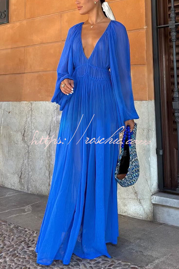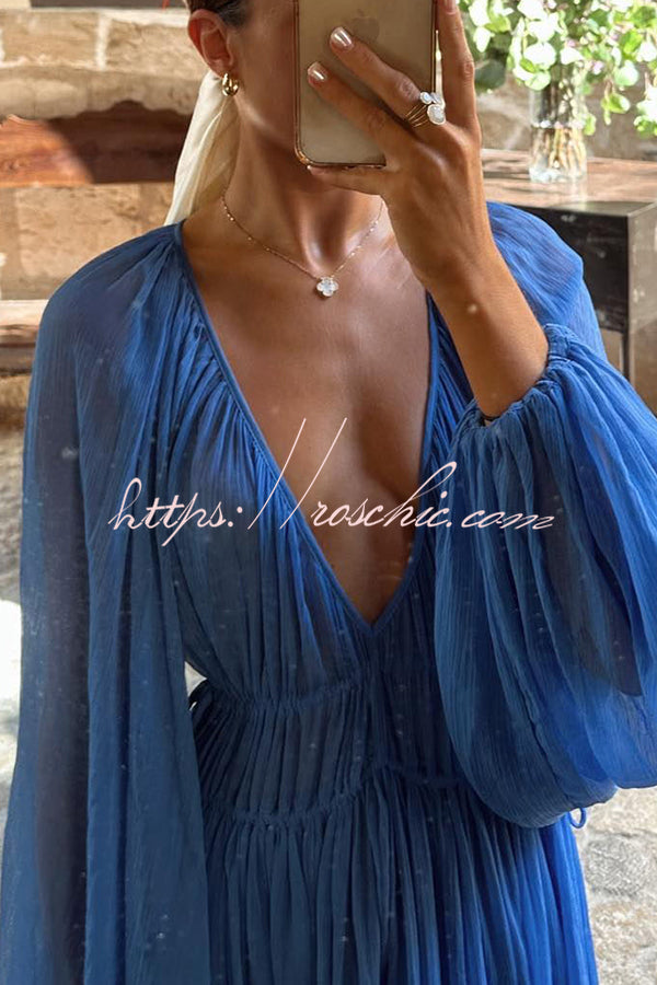 Blue Gemstone Chiffon Ruched Gathered Waist Maxi Dress