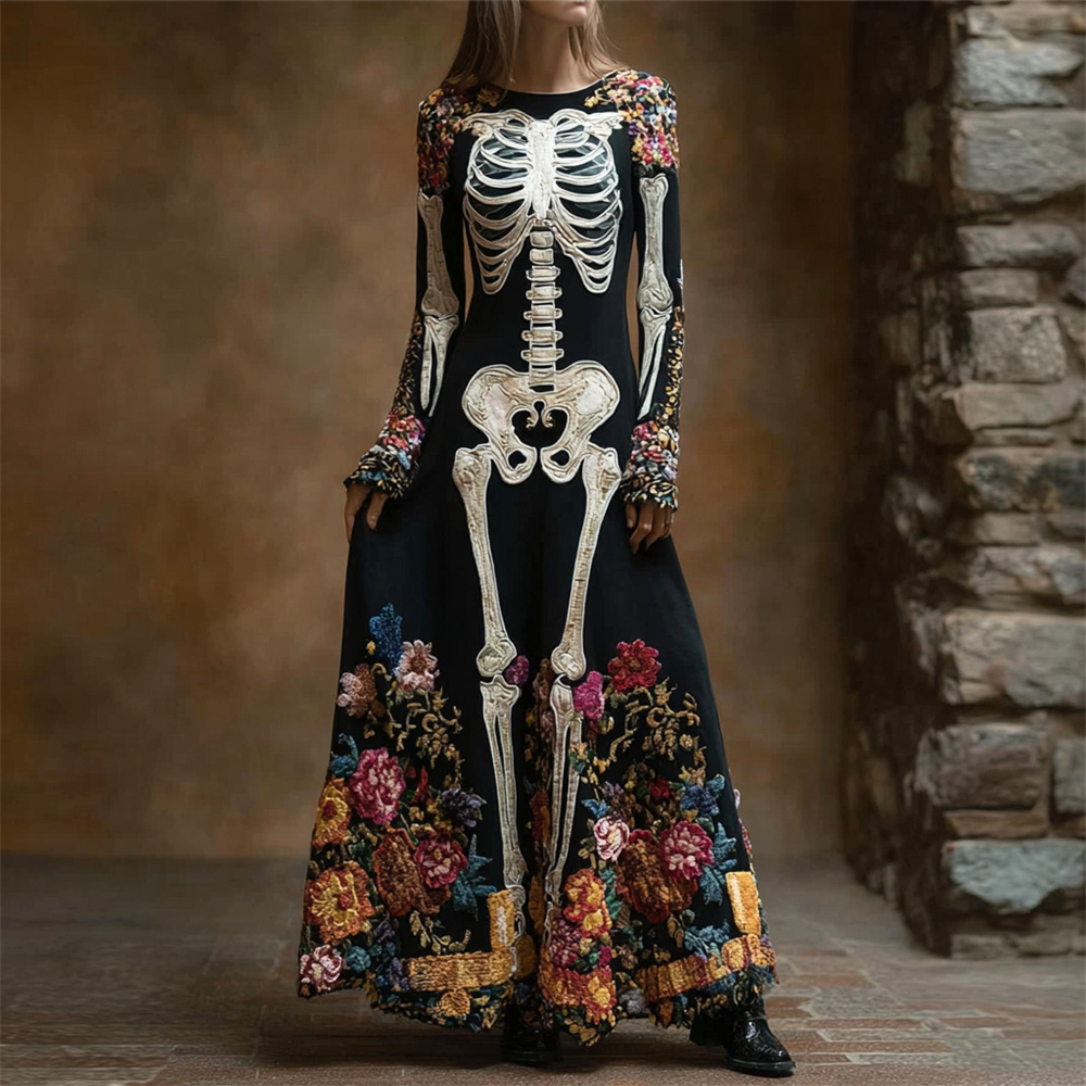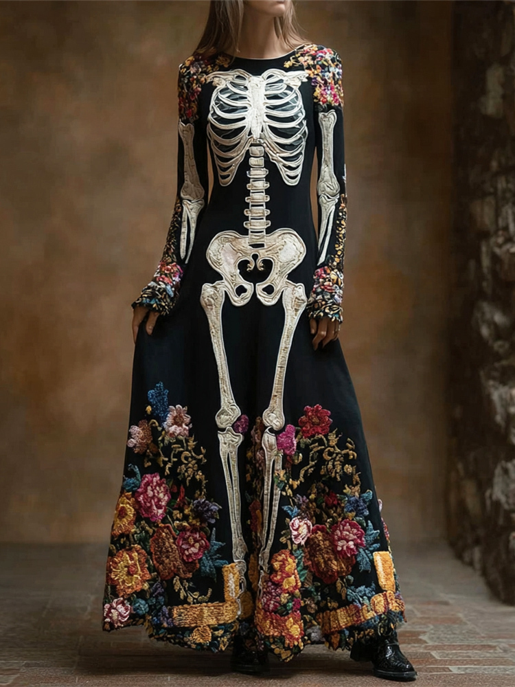 Human Skeleton Floral Embroidery Women's Long-sleeved Flowing Maxi Dress