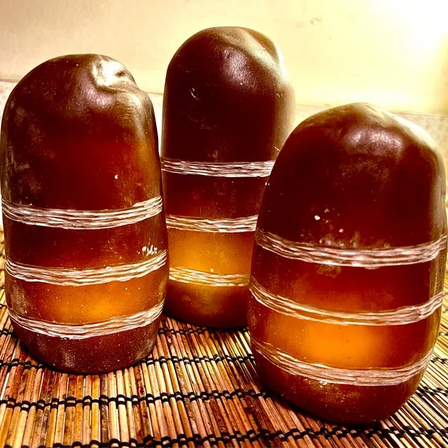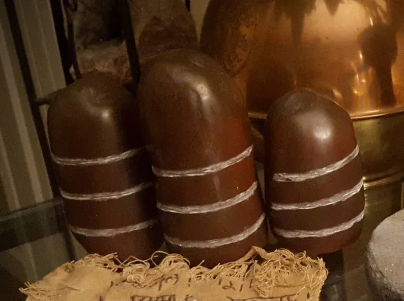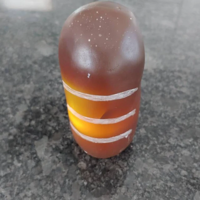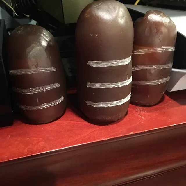 The Sankara Stone is Solid Resin and Very Durable. It measures; 6 inches tall x 3.5 inches in diameter. The Sankara Stone has Three indented lines on the Stone. It is Brown and the Indented lines are White, just as it was seen in Film.