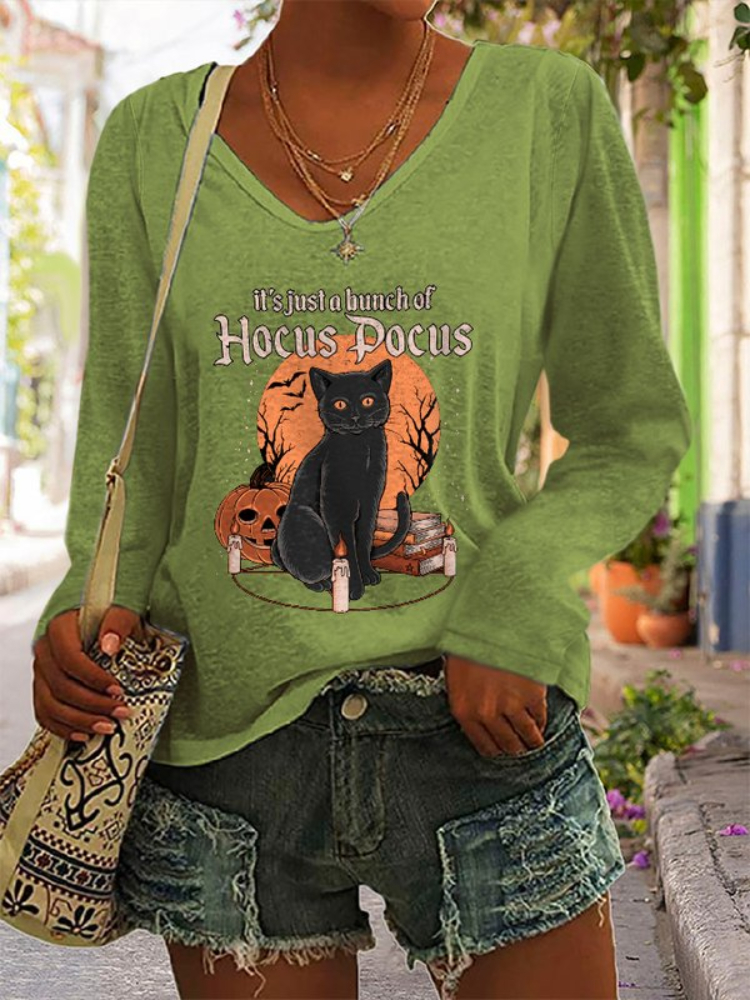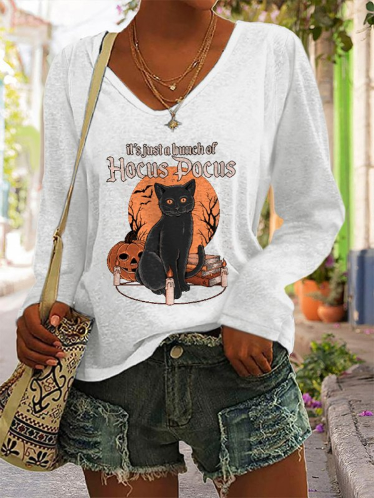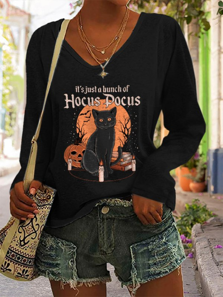 It's Just A Bunch Of Hocus Pocus Long Sleeve Halloween Black Cat Print T Shirt