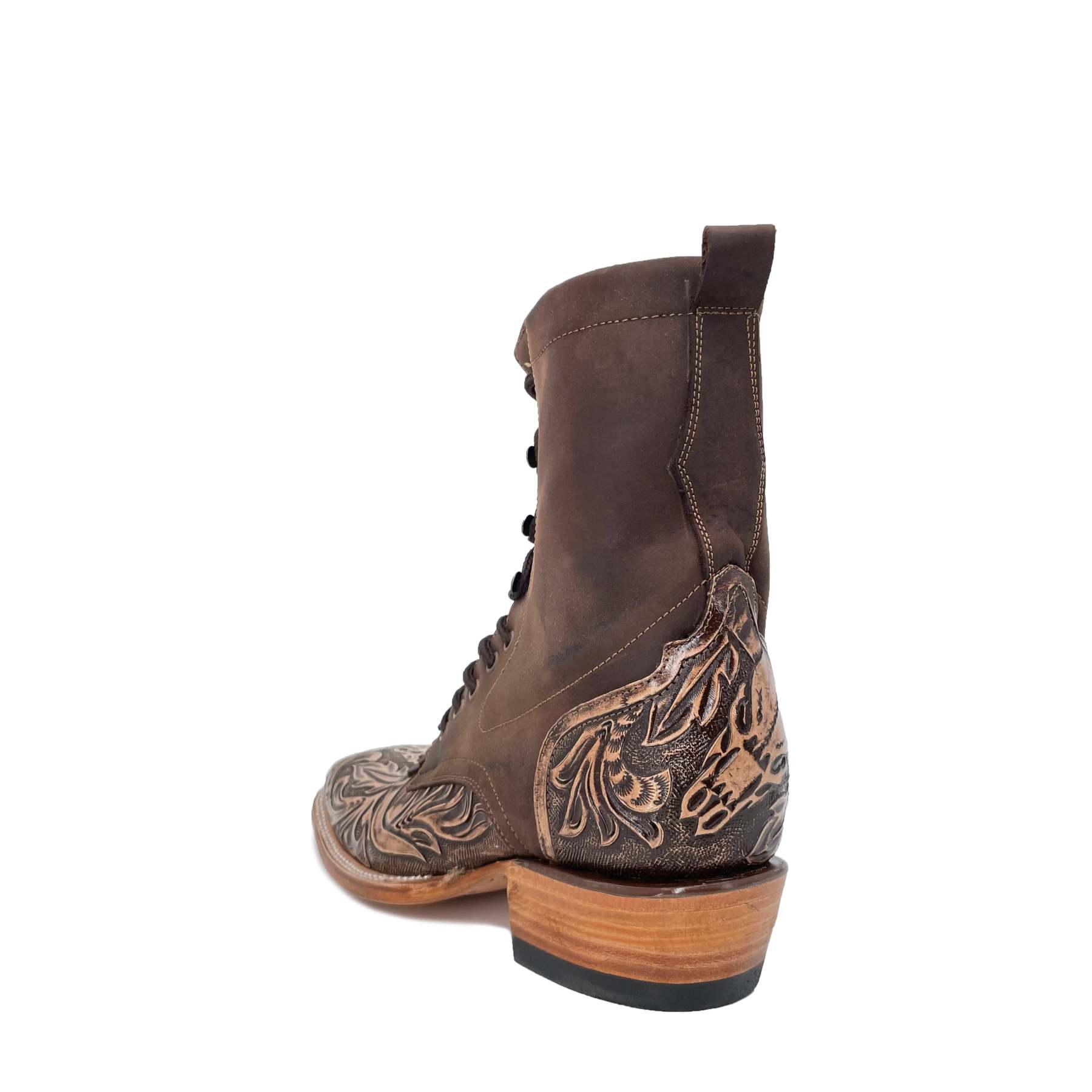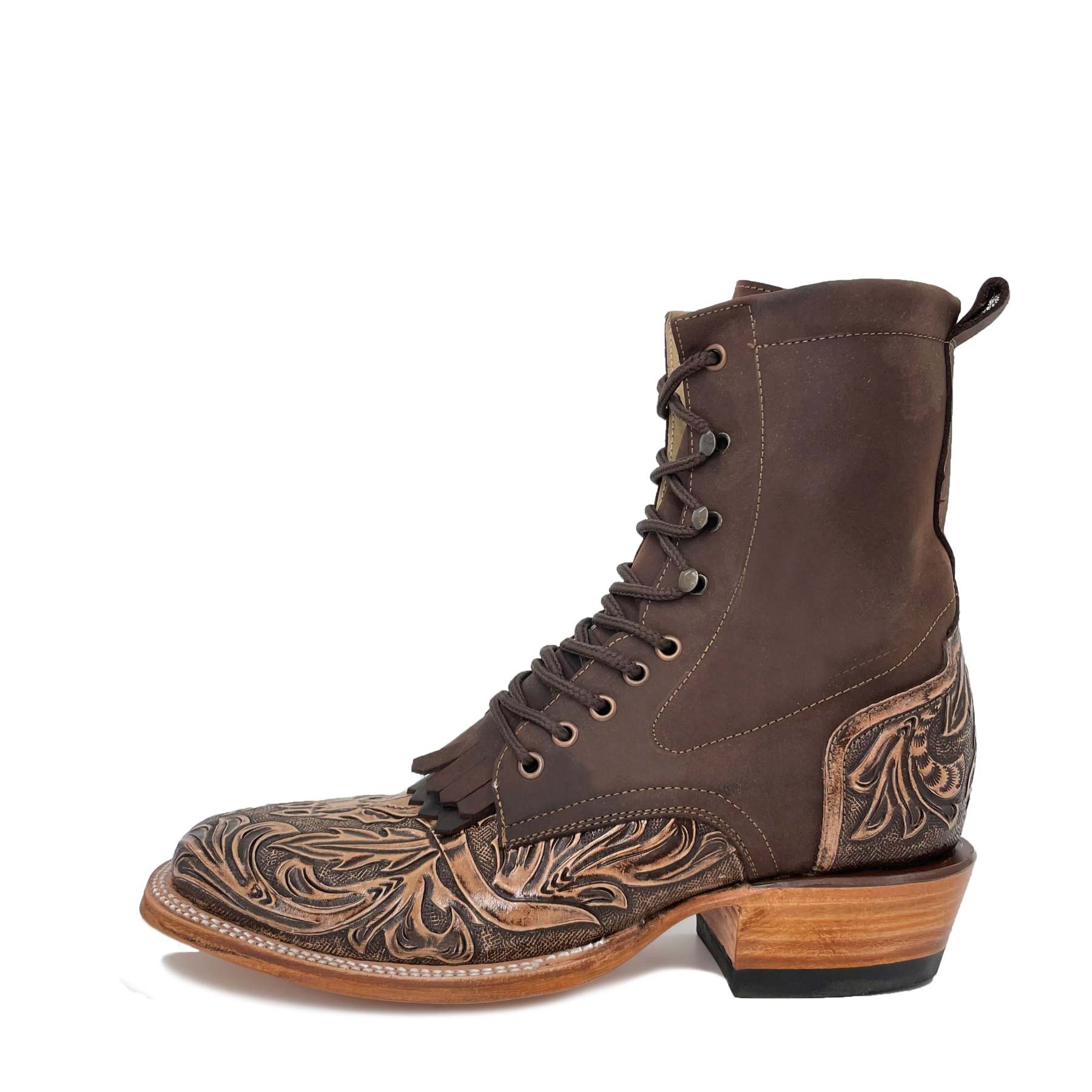 Our Lace up Longhorn in rustic finish and angled heel is inspired by all riders and cowboys. The hand tooled design puts a modern spin on this practical style.