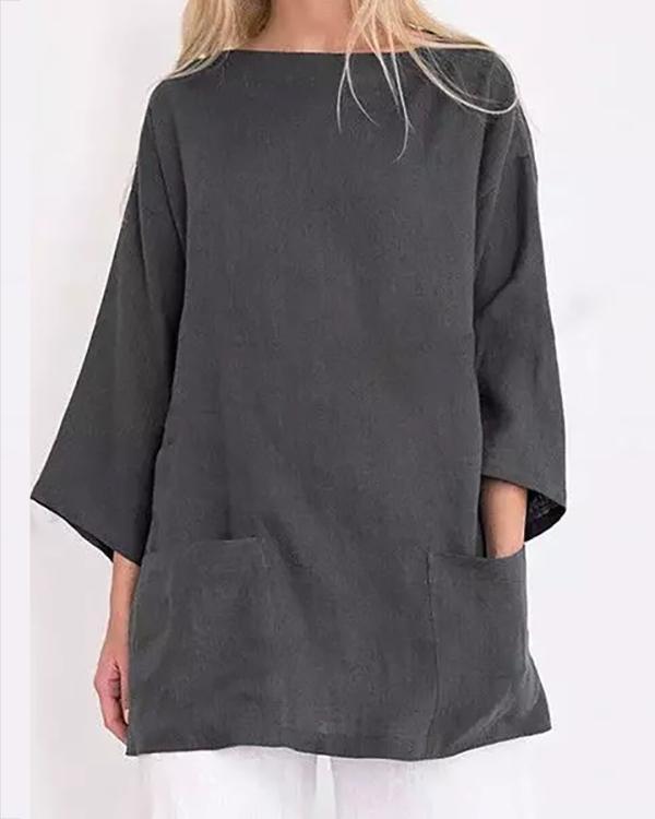 Ladies Solid Color Casual Round Neck Cotton and Linen T-shirt