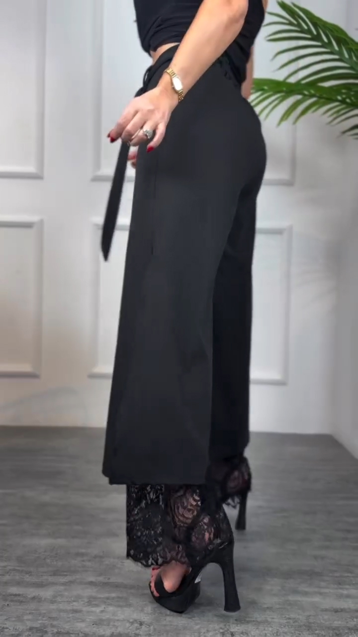 Embrace Sophisticated Edge: Black Wide - Leg Pants with Lace Detail