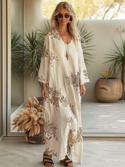 Linen Boho Stylish Printed Kaftan Maxi Dress