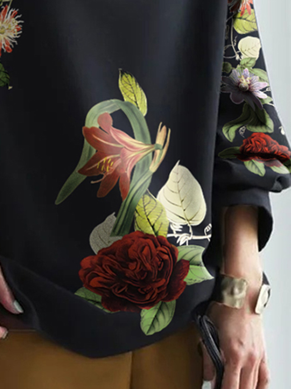 Long Sleeves Loose Asymmetric Floral Printed Split-Joint High Neck T-Shirts Tops
