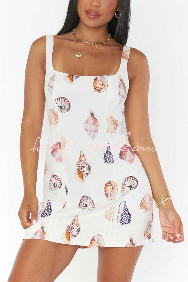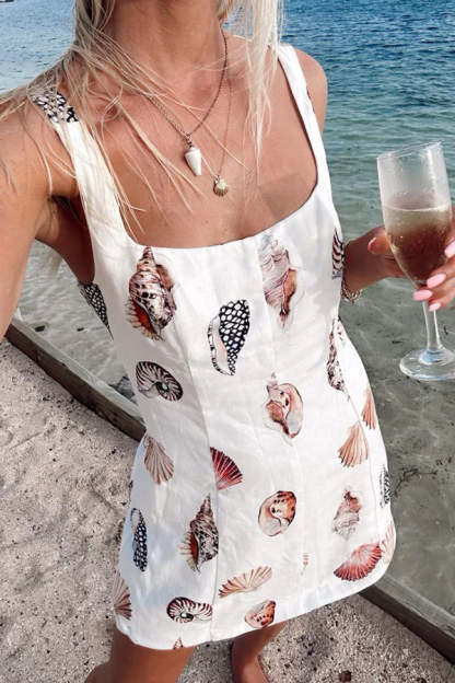 • The Steph Mini Dress is the perfect white micro mini for bachelorette season! Decorated with a lovely shell print and features an open back. Style with dainty accessories for the ultimate for the bride look.