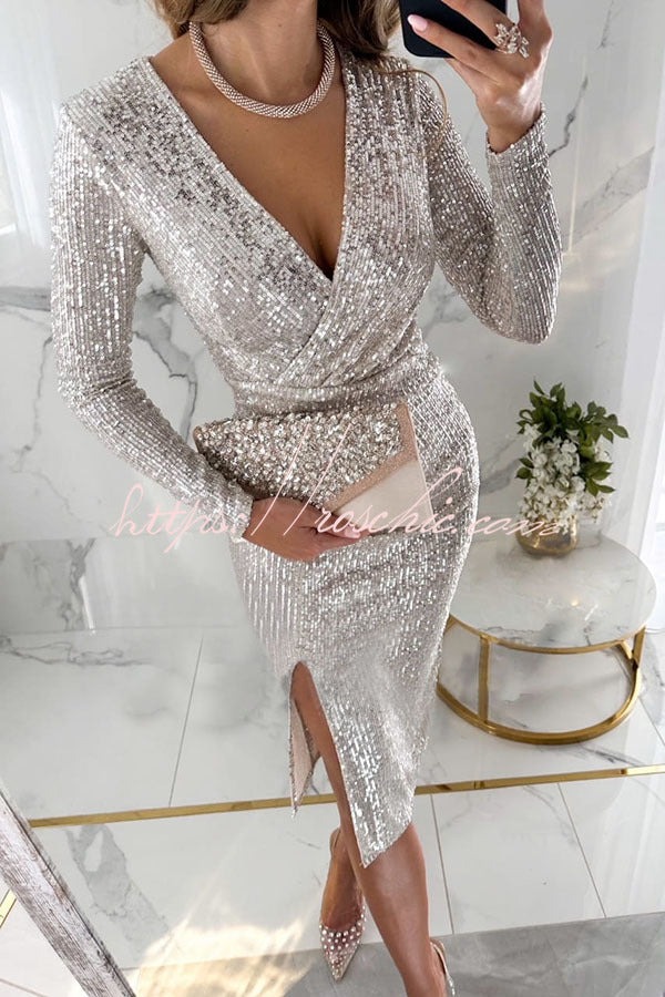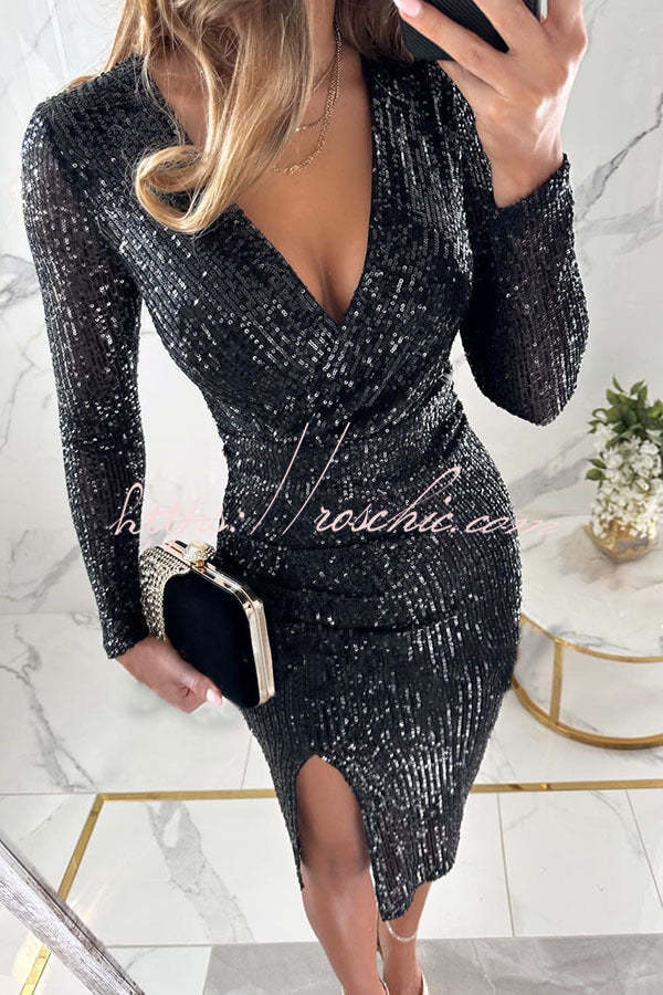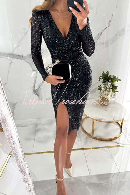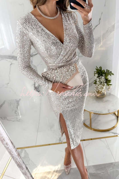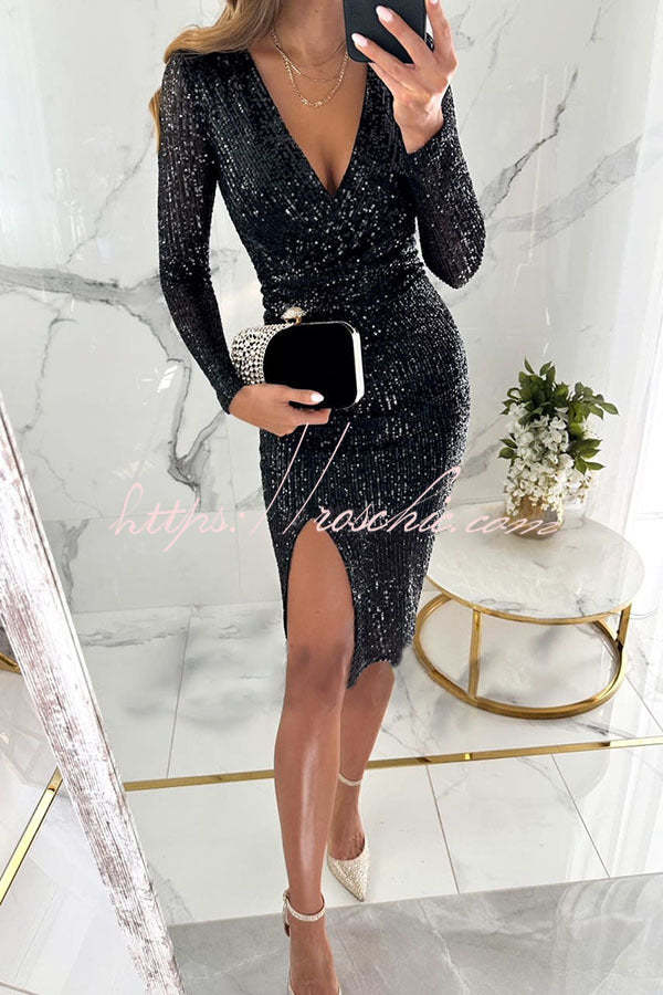 Main Character Sequin Long Sleeve Side Slit Midi Dress