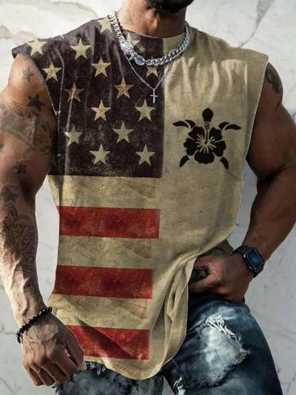 Men's American Flag Hawaiian Turtle Tie Dye Print Tank Top