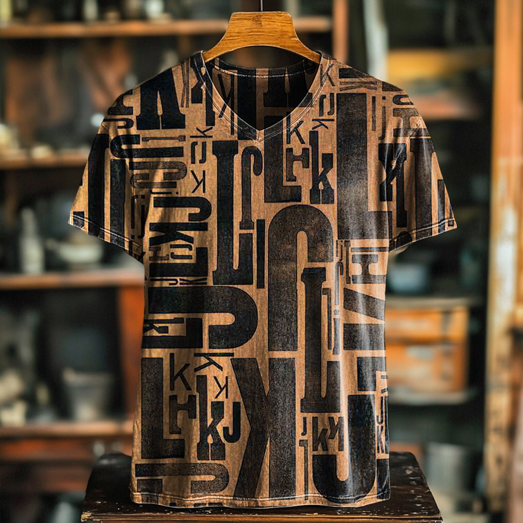 Men's Art Painting National Style Retro Letter Print V-Neck Short Sleeve