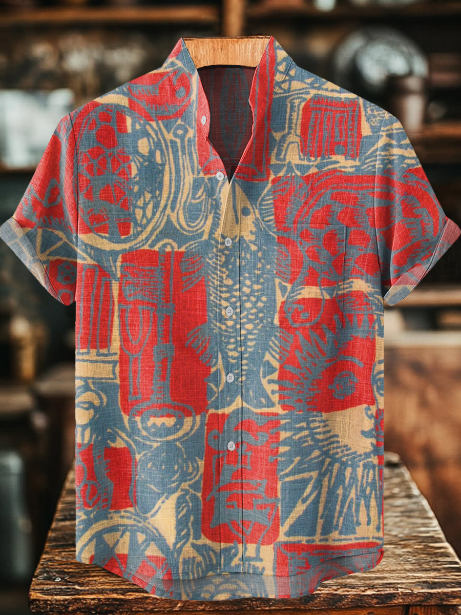 Men's Bohemian Ethnic Collage Art Pattern Print Casual Short Sleeve 100% Cotton Shirt