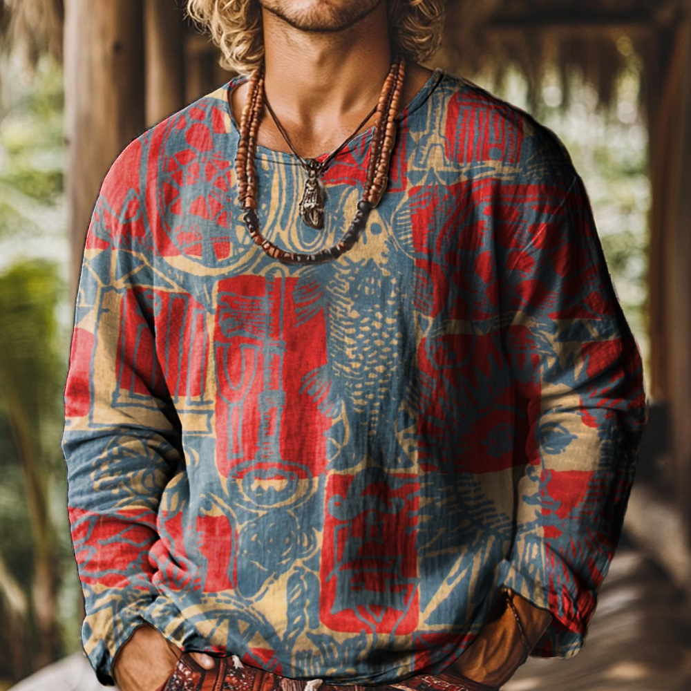 Men's Bohemian Ethnic Collage Art Pattern Print Round Neck Long Sleeve Cotton Shirt